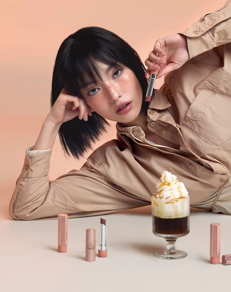 For the lips, she alternates between the 3CE lip jelly and Glyf lip gloss #04, creating a translucent, hydrated lip that feels true to everyday wear.