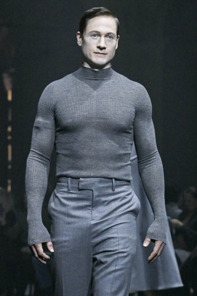 More on the nose, Matières Fécales collection entitled “The One Percent” had Bryan Johnson in a hyper-stylised techbro outfit with a grey turtleneck and slacks. A multi-millionaire obsessed with life extension, having received blood transfusions from his son in a try to “revitalise” himself, he’s the perfect example of power and all the deportments that surround it. Both mocking him and amplifying the show’s storytelling, Matières Fécales used their casting in a clear message that doesn’t endorse Johnson’s activities or obsession with immortality.
