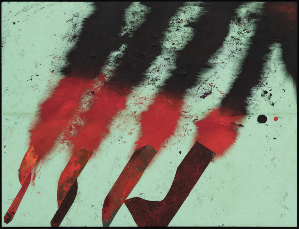 The animalistic crawl-mark resemblance is a revolution to the WIDW series, suggesting that “rather than observing the action through a window, the combination of oil paint with bright cardboard swatches is tumultuous, as if a storm has blown the window apart and set its elements in motion.” The raw energy can be recognised by the intersecting diagonals breaking geographical boundaries with cardboard components blasting across the canvas.