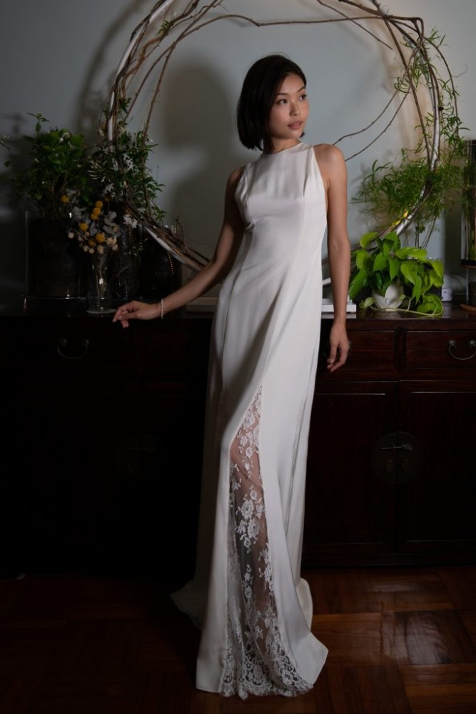 AtelierYVF Ethical Bridal takes its name from founder Yasmina Viale-Fraine, who started sewing at age eight and moved from Paris to Hong Kong in 2011 and founded atelierYVF in 2017. Her designs feature an artistic, modern bohemian style crafted out of silks from China, Korea and Japan, and French laces from Calais, Chantilly, Lyon and Alençon. The brand mixes European and Asian influences and bring a more ethical and sustainable offer to evening and bridal wear.