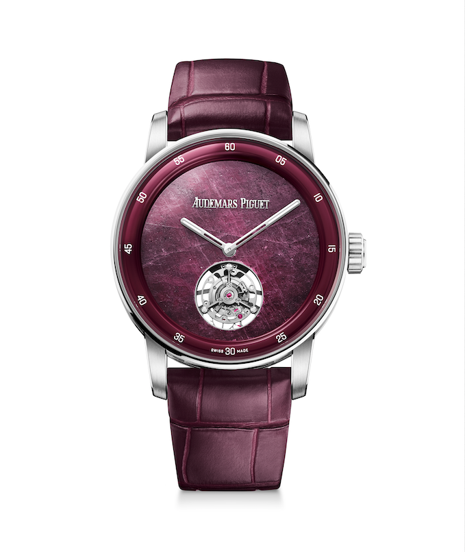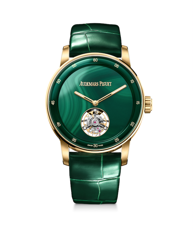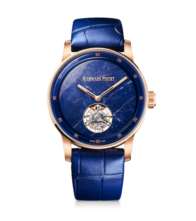 First in the line-up was a trio of Code 11.59 SelfwindingFlyingTourbillons,poweredbythe Calibre 2968, an ultra-thin selfwinding flying tourbillon first introduced in 2022 and adapted for the 38mm format – a further demonstration of AP’s expertise in miniaturisation. Paired with a gold case chosen to enhance its colour, each dial is crafted from natural stone – ruby root from Tanzania, blue sodalite from Brazil and verdant malachite from Zambia – cut and polished to reveal unique veining and tonal depth. The result is that no two are identical, giving every watch both individuality and a sense of rarity.