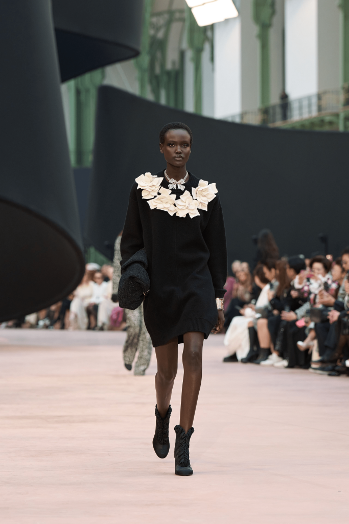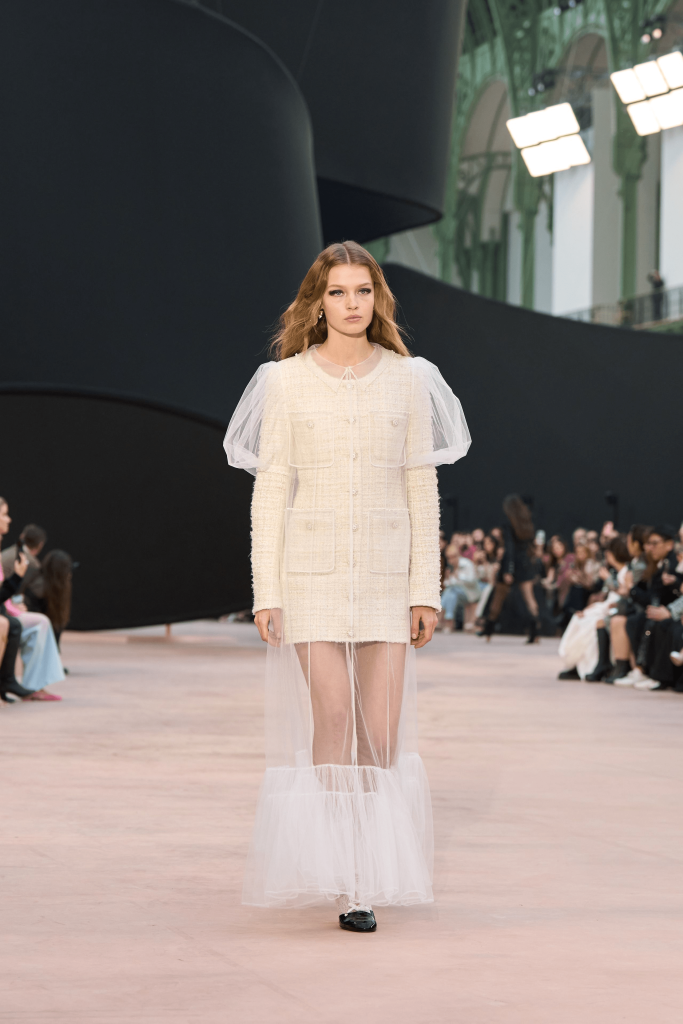 Presented against a black ribbon backdrop at the Grand Palais, Chanel’s AW25 collection focused on exploring proportions, perceptions and dreamlike interpretations of the house’s signature motifs. Several pieces featured ribbons and bows, incorporating layering and new textures, while other notable items included a military-inspired anthracite tweed jacket trimmed with matte satin ribbon and a sheer black organza tunic top secured with pretty bows at the balloon sleeves.