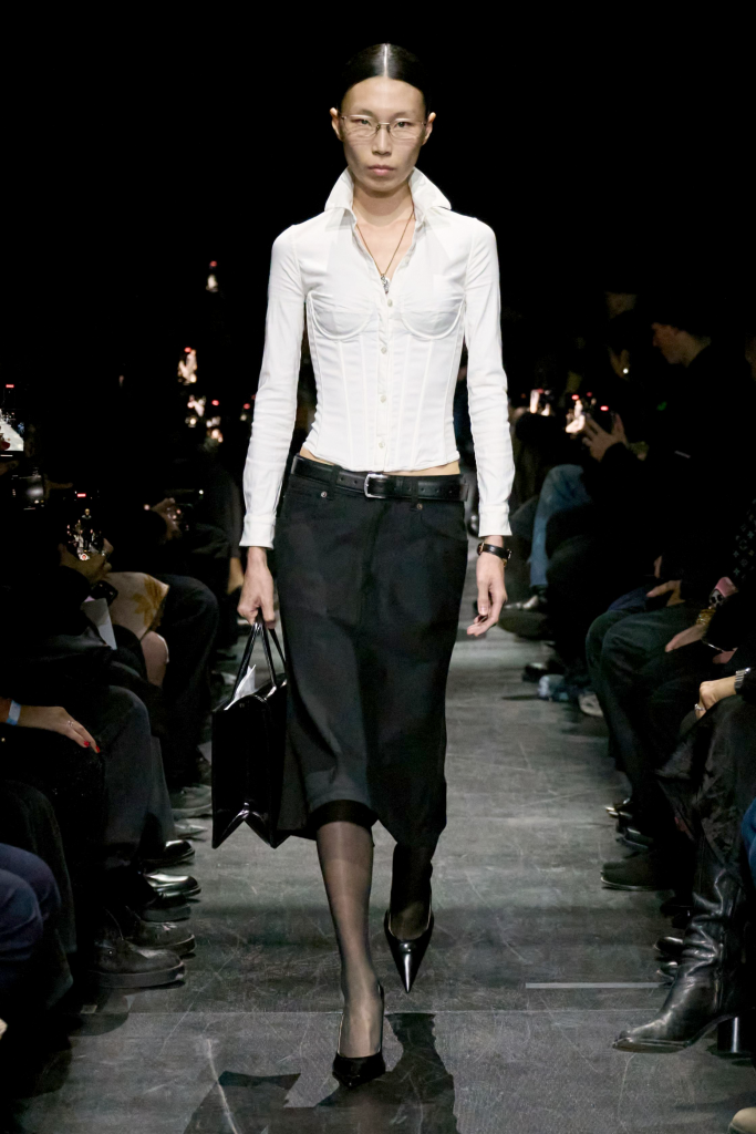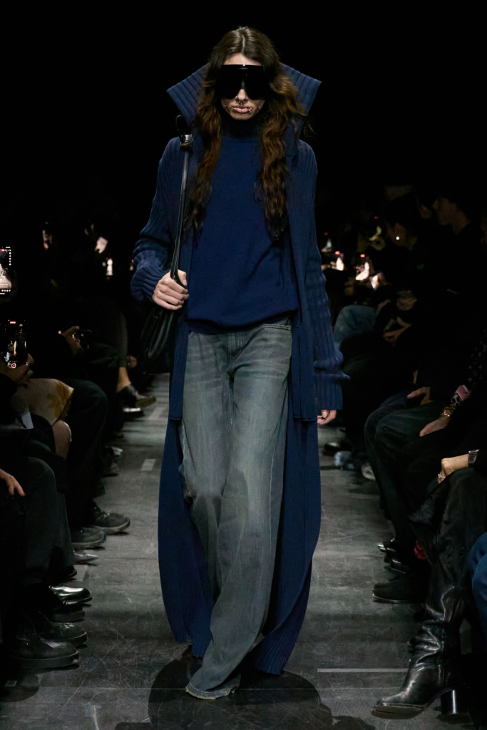 Held inside the Dome Courtyard in Paris’s 7th arrondissement, Balenciaga’s AW25 show presented a collection as sharp as it was practical. It opened with a bevy of tailored suits worn by men and women, followed by eveningwear and streetwear. There was a ribbed sweater dress flipped around and cinched at the waist with a decorative pin, a hoodie extended into a flaring, monastic robe, and slimmed-down puffer jackets that were given the bustier treatment and adorned with giant furry hoods.