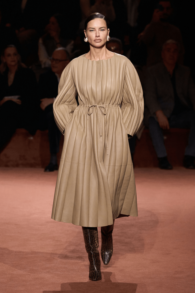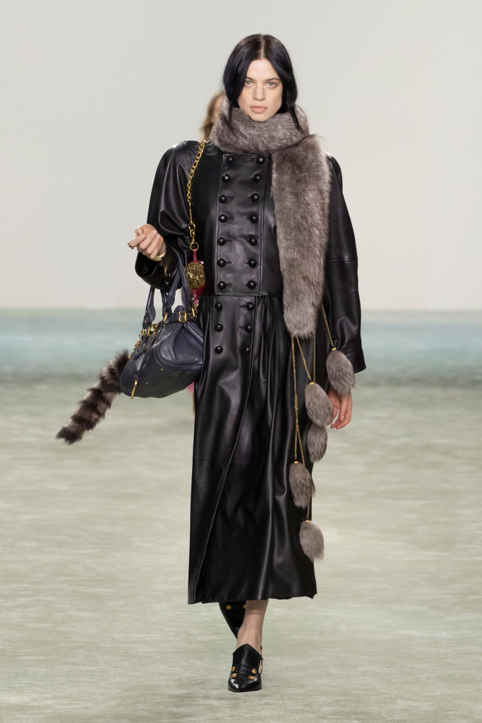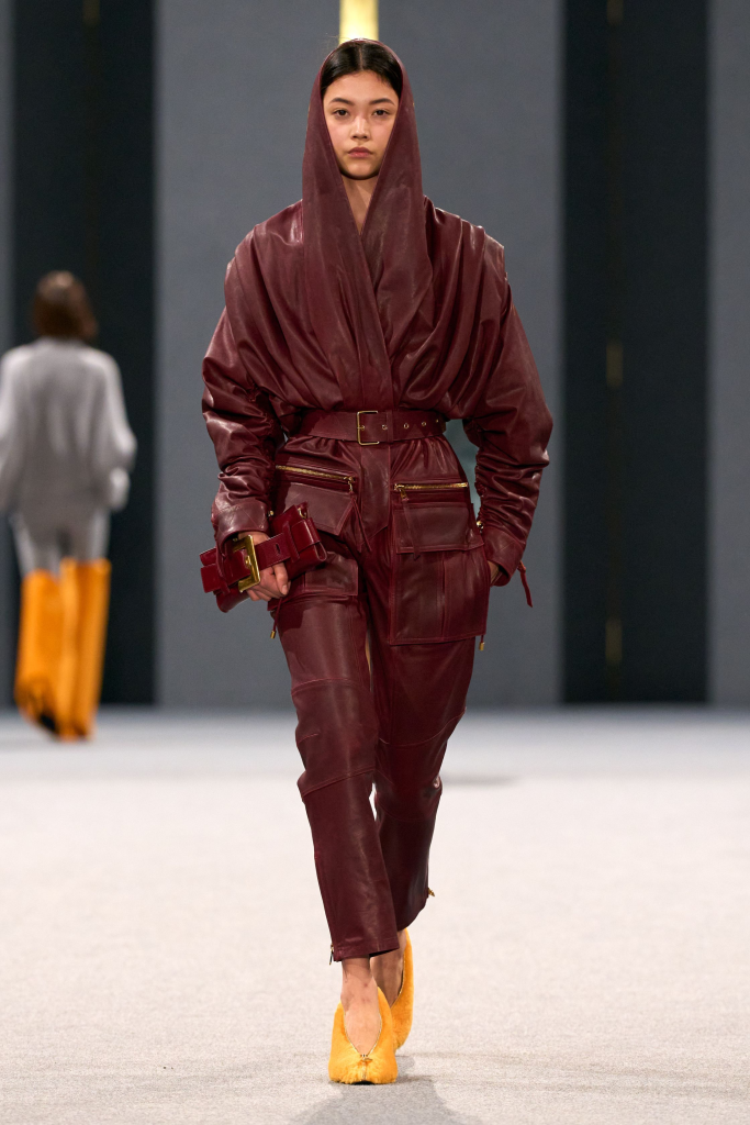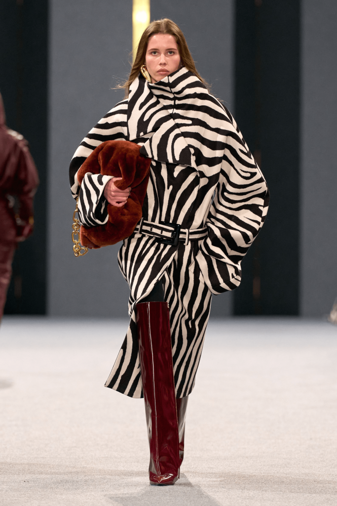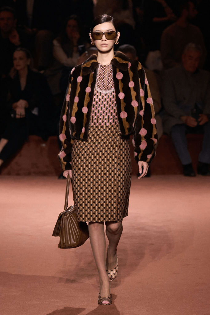 Charged with creating an autumn/winter collection to kick off the brand’s centennial year, Silvia Venturini Fendi turned to the staples that have defined it throughout the years. Shearling was quilted and patchworked to mimic the noble furs of the house’s origins, while satin balza skirts and sculptural corolla jackets paid homage to midcentury couture. The colour palette, inspired by Rome at sunset, transitioned from deep greens and petrol blues to rich chocolate browns and graphite before softening into terracotta, dusty rose and buttery neutrals. A final flourish of bubblegum pink and scarlet injected a vibrant contrast, closing the collection on a bold note.