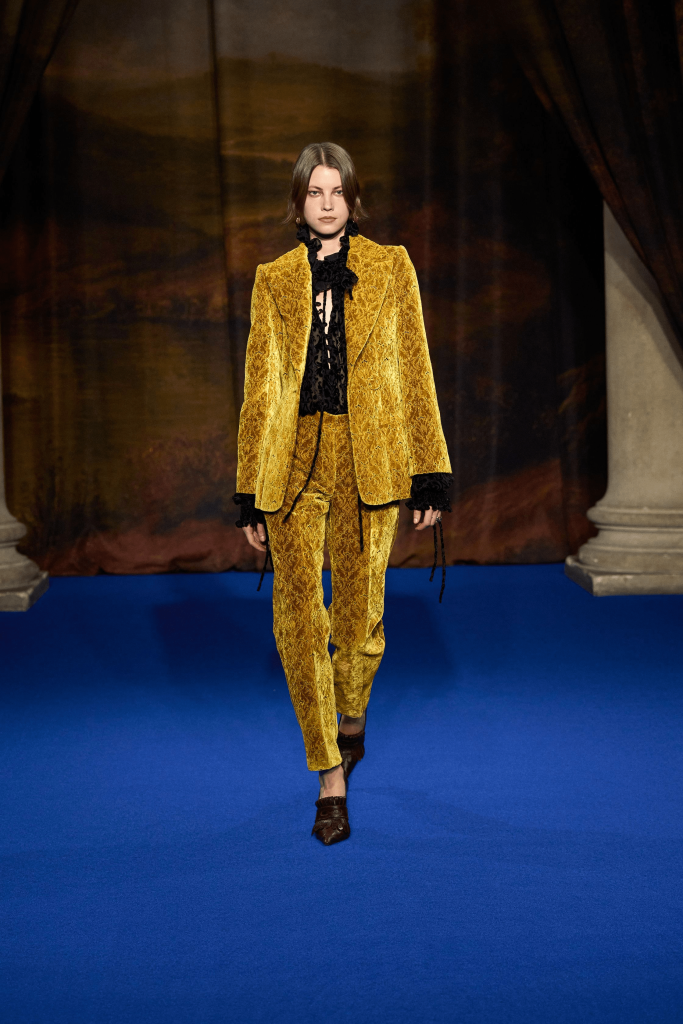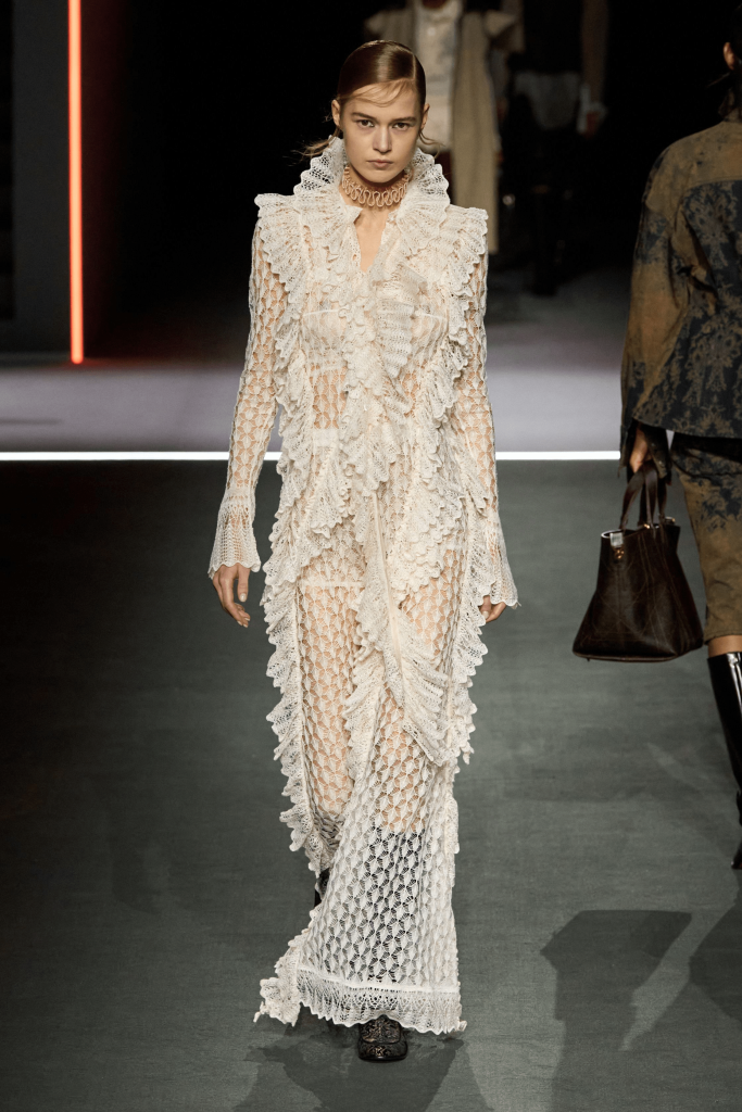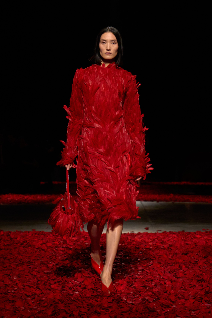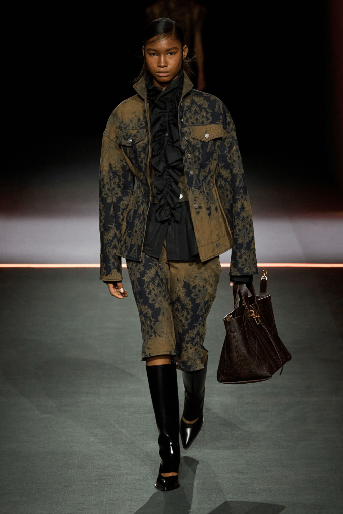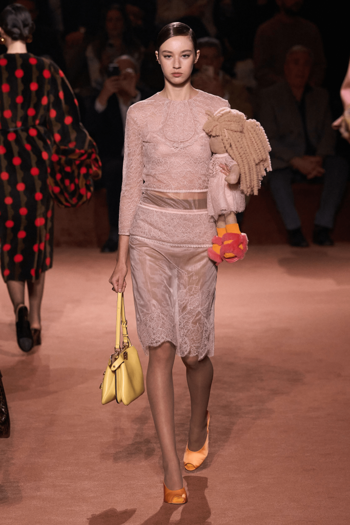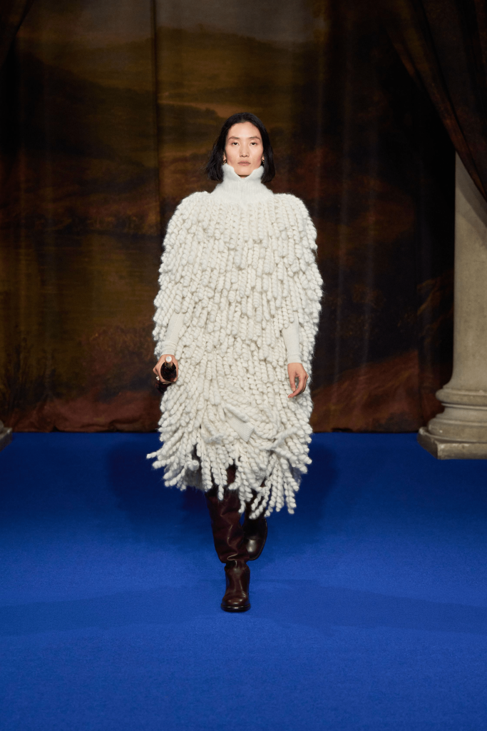 Charged with creating an autumn/winter collection to kick off the brand’s centennial year, Silvia Venturini Fendi turned to the staples that have defined it throughout the years. Shearling was quilted and patchworked to mimic the noble furs of the house’s origins, while satin balza skirts and sculptural corolla jackets paid homage to midcentury couture. The colour palette, inspired by Rome at sunset, transitioned from deep greens and petrol blues to rich chocolate browns and graphite before softening into terracotta, dusty rose and buttery neutrals. A final flourish of bubblegum pink and scarlet injected a vibrant contrast, closing the collection on a bold note.