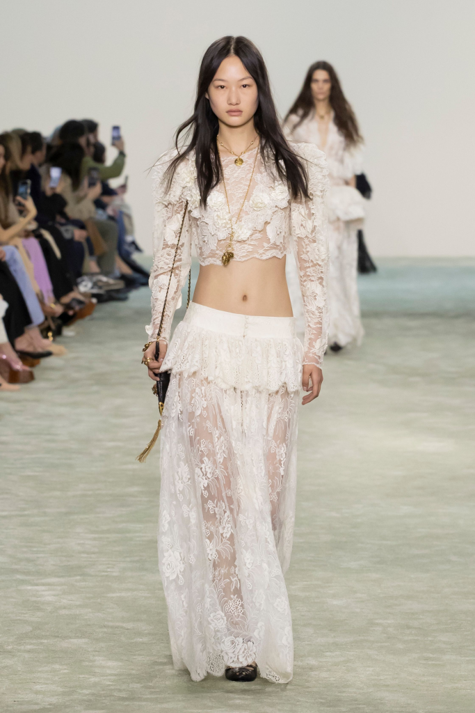 Showcasing a stunning evolution of boho-chic dressing, infused with a romantic flair, highlights at Chloé included ivory or peach silk blouses with broad don’t-messwith- me shoulders, commanding sleeves, gathers galore and meaty cuffs, giving them the oomph of jackets, alongside some delicate lace dresses with frothy peplums pivoting at the hip. Retro elements were also present, like Chloé-branded belts resting low on maxi skirts and faux-fur tails swaying from garments like playful charms.