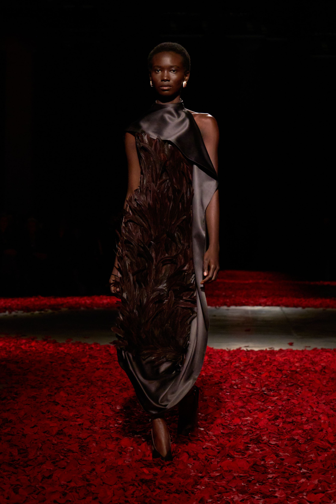 Maximilian Davis, inspired by the world of dance, focused on creating clothing that allows for easy movement. He elevated closet staples to new heights with pieces in a palette of red, camel, white and black, reflecting a devotion to enduring and “normal” clothing archetypes, as favoured by Pina Bausch. The collection featured knit tube dresses, double-breasted topcoats, satin skirts and sheer flapper dresses adorned with shearling and lace for added modesty.