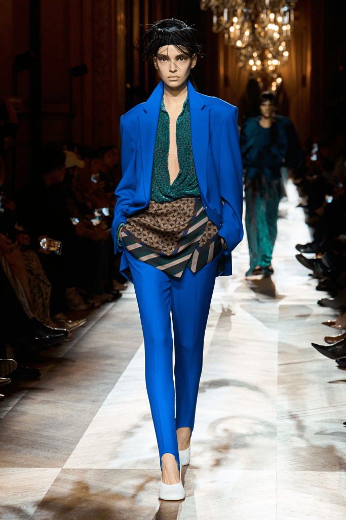Julian Klausner’s debut collection for Dries Van Noten was a celebration of transformation – the quiet yet powerful dialogue between past and future that lies at the heart of the brand. A monochrome palette of deep black and moody hues dominated the runway at first, before gradually giving way to an explosion of colour and pattern: olive green met violet, checks clashed with polka dots, burnt orange merged with grey, and green dots contrasted against purple.
