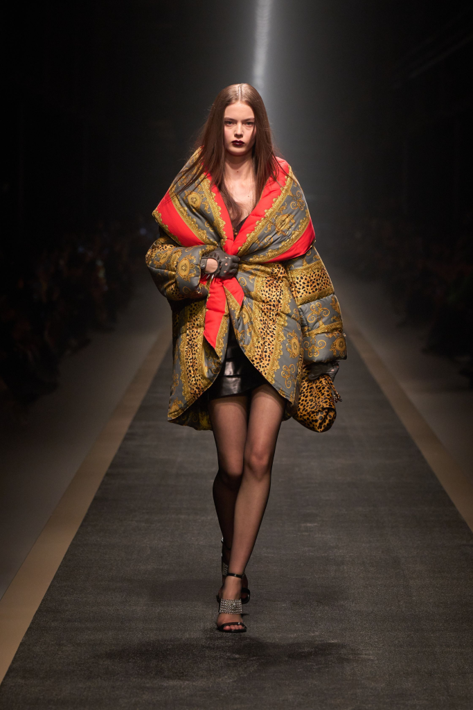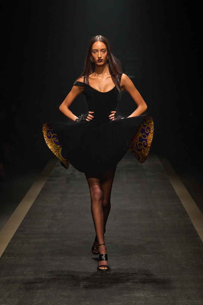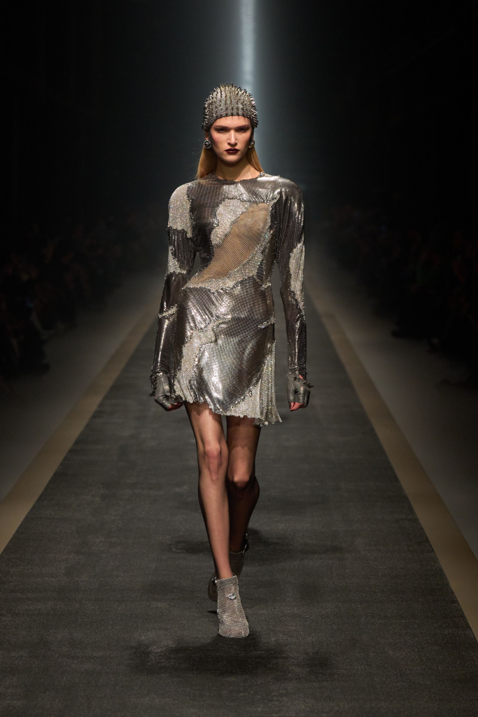Dubbed Versace Superheroes, Donatella’s Versace AW25 collection was a celebration of fearless individuality. The show opened with striking pieces crafted from Versace Home quilts, sculpted into dramatic volumes and printed with the house’s signature motifs, evoking the opulence of Gianni Versace’s residences. The brand’s historical archive once again served as a key point of reference, appearing as off-the-shoulder silhouettes and voluminous crinoline skirts paired with structured corsets from Atelier Versace Fall 1997.