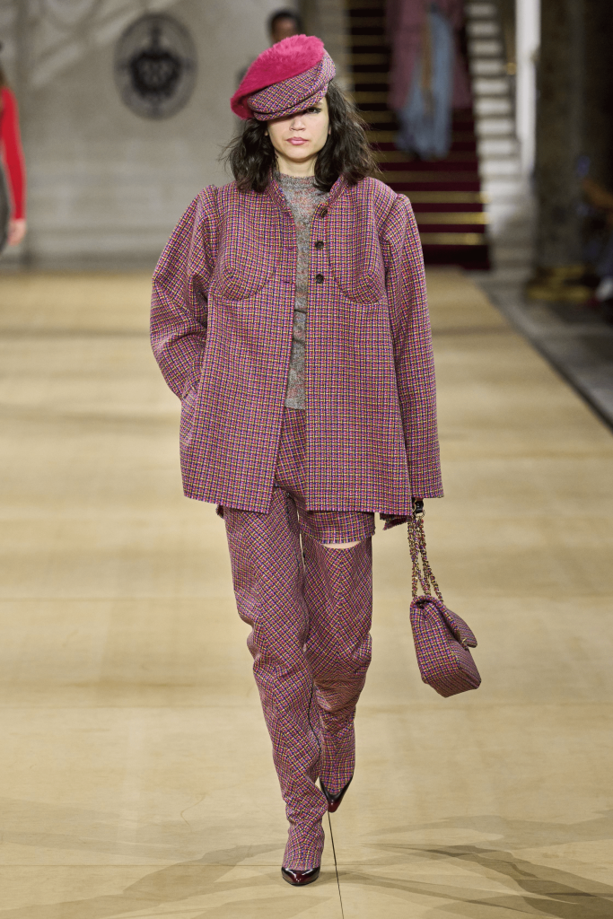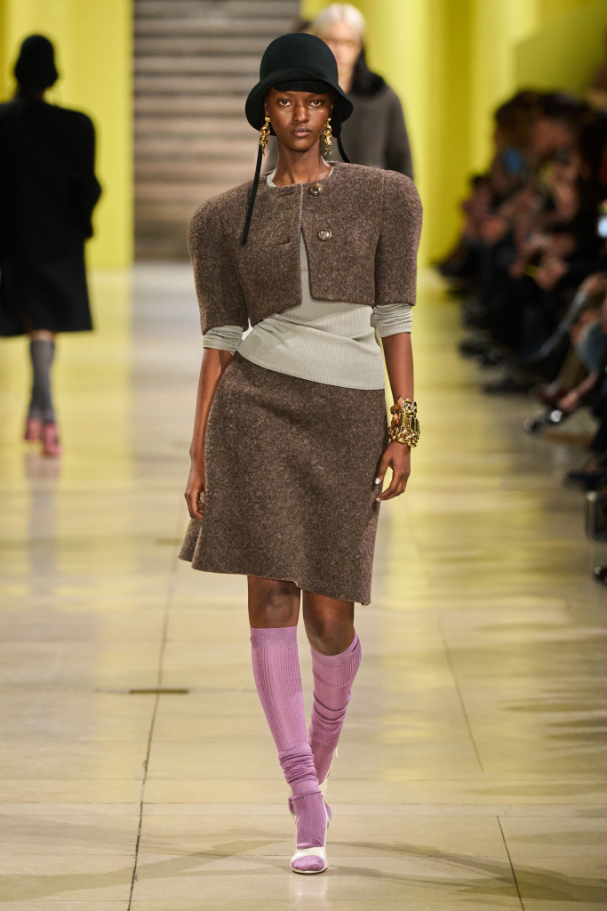 Creative director Andreas Kronthaler continued to honour his late wife’s legacy with a collection that merged sensual tailoring with dramatic layers, rich textures and the brand’s signature rebellious spirit. Classic Westwood hallmarks like bold plaids, slouchy suiting and deconstructed silhouettes were reimagined with modern twists while eccentric details like birdcage handbags, contrasting socks and feathered heels jazzed up every look.