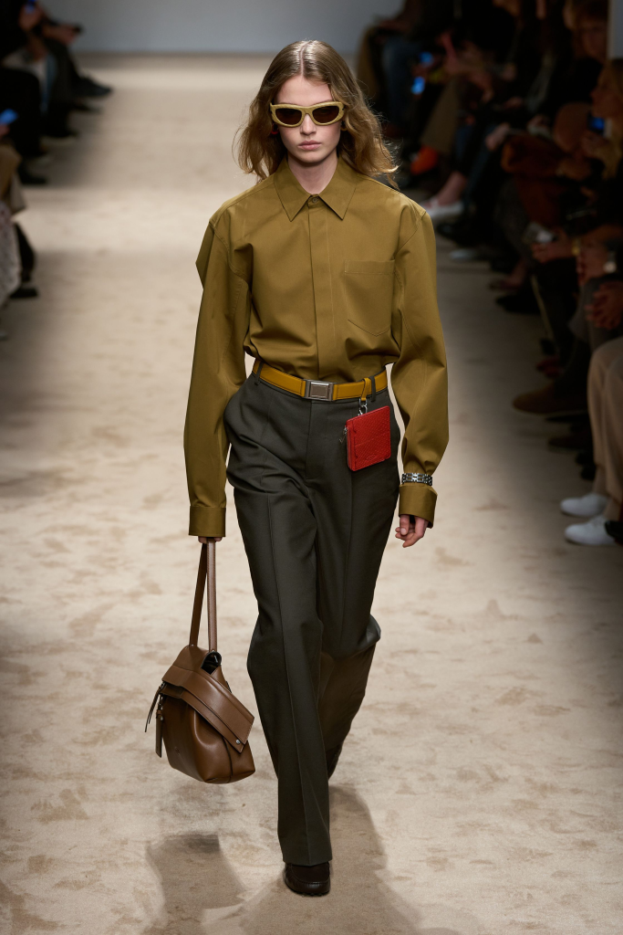 Under the creative direction of Matteo Tamburini, the Tod’s presentation was a masterclass in Italian craftsmanship, blending timeless elegance with human artistry. Outerwear dominated with classic elongated silhouettes and luxuriously felt materials, from cashmere coats to suede trenches, rendered in an earthy palette of burgundy, olive green, black and white. Every stitch, cut and fold whispered Made in Italy, reminding us that craftsmanship is not just technique – it is intelligence made tangible.