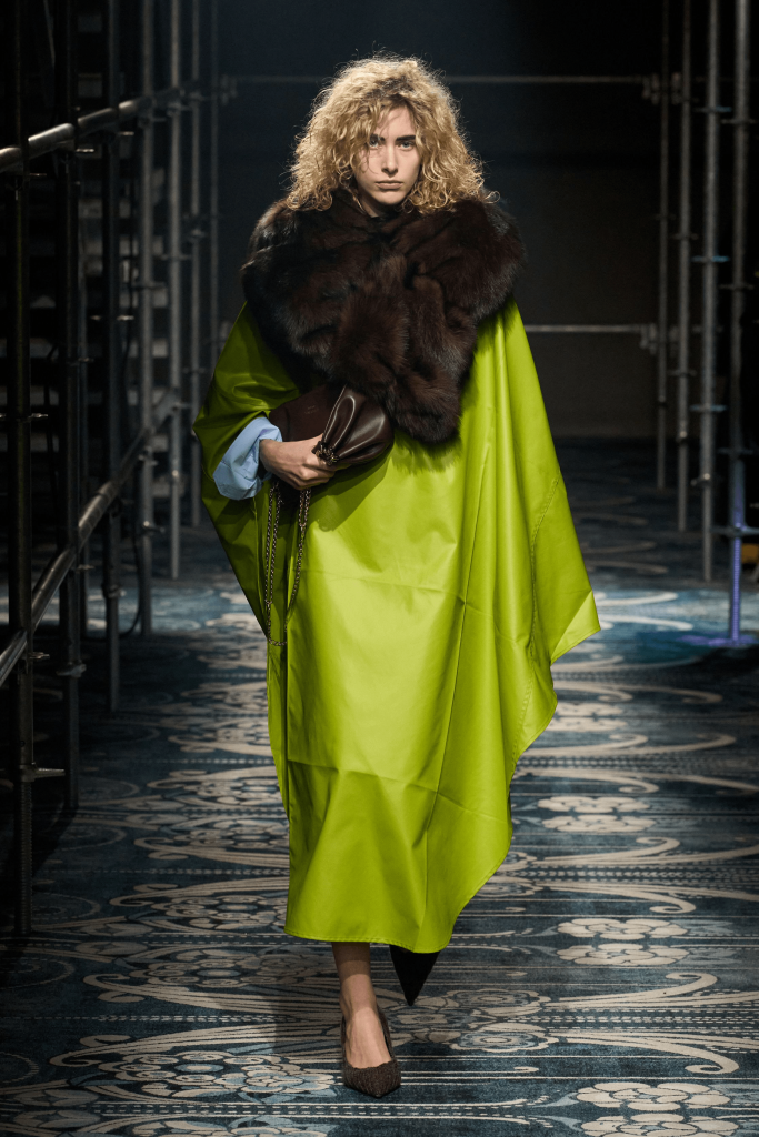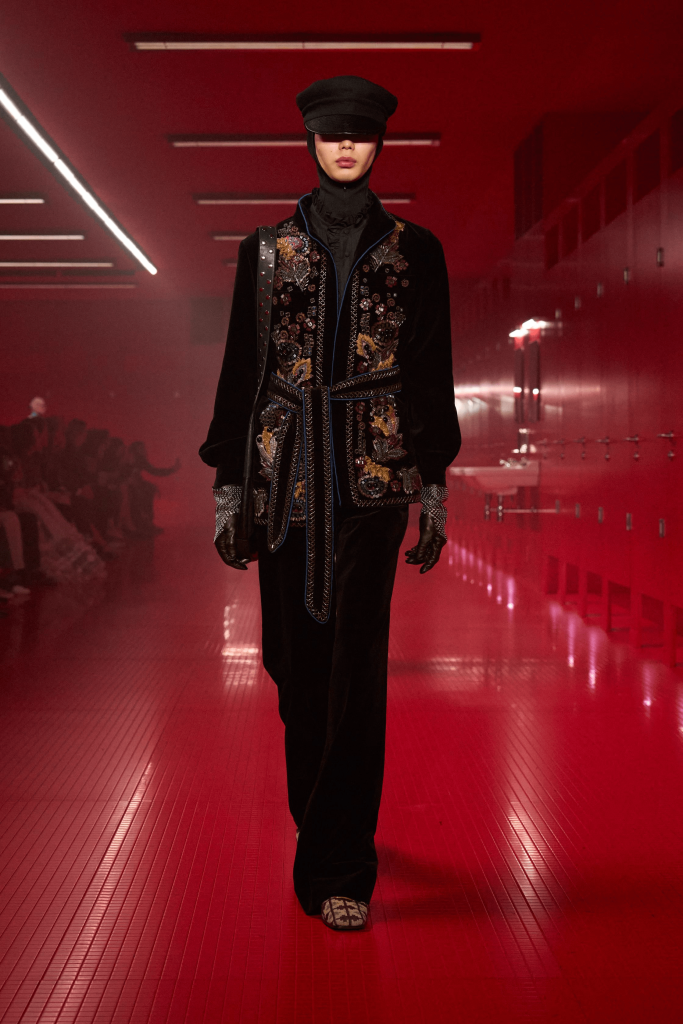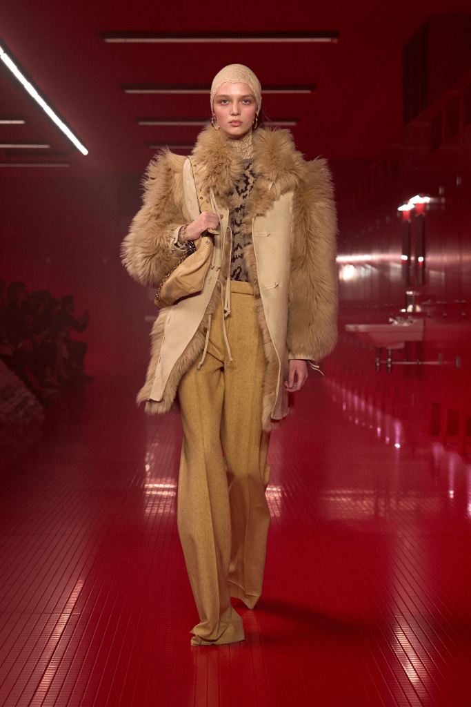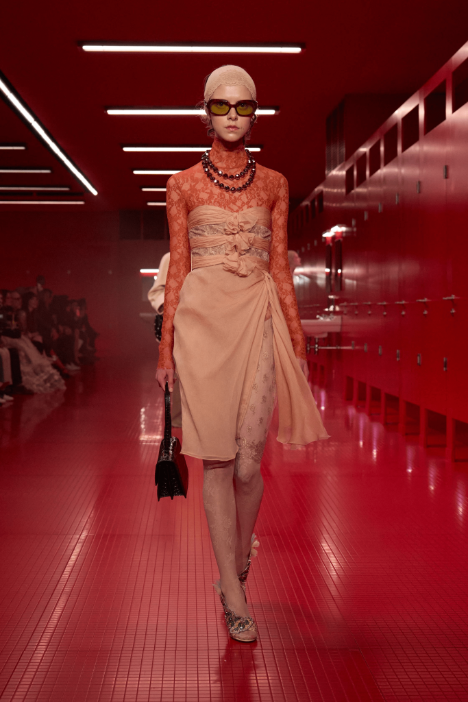 Alessandro Michele took a philosophical turn this season, presenting a collection that aimed to challenge our perceptions of intimacy and its complex relationship with the self. The show was set in a red public bathroom, dismantling rigid societal norms to celebrate fashion as a language of self-expression unbridled by boundaries. His models sported mixtures of lingerie, sheer lace and athleisure. But there were also looks for seeing and being seen: classic, slightly retro suiting, bow-embellished ’40s day dresses and gowns – and even for nightlife, such as a strapless going-out top paired with jeans, early-aughts style.