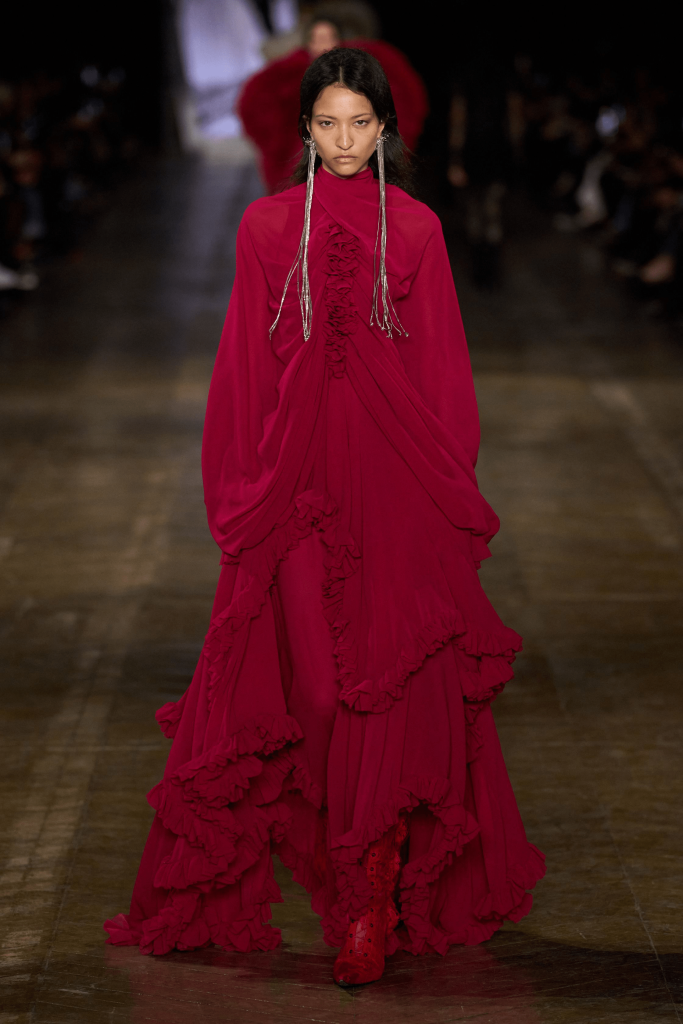 On the final evening of Paris Fashion Week, Saint Laurent delivered an unforgettable spectacle beneath the Eiffel Tower. Against a backdrop of brown-hued marble projections, models took to the runway in pieces that blended strength and femininity. Sharp shoulders and rich, jewel-toned colours dominated, with ribboned highneck dresses paired with pointed stilettos. Anthony Vaccarello proved that sometimes, sticking to classic but well-tailored pieces like pencil skirts and coats can still make an impression.