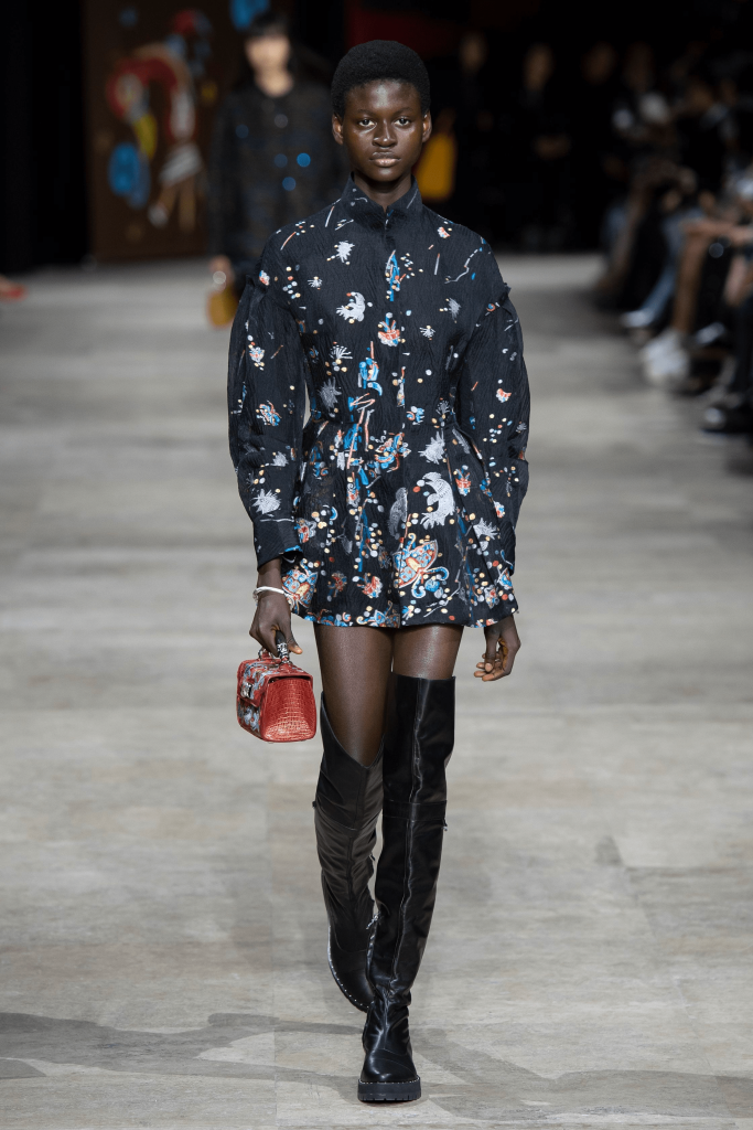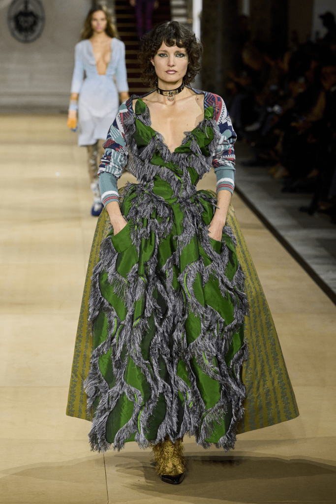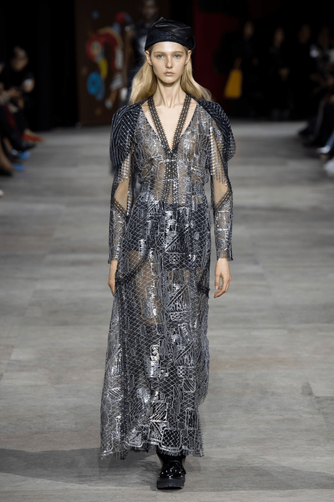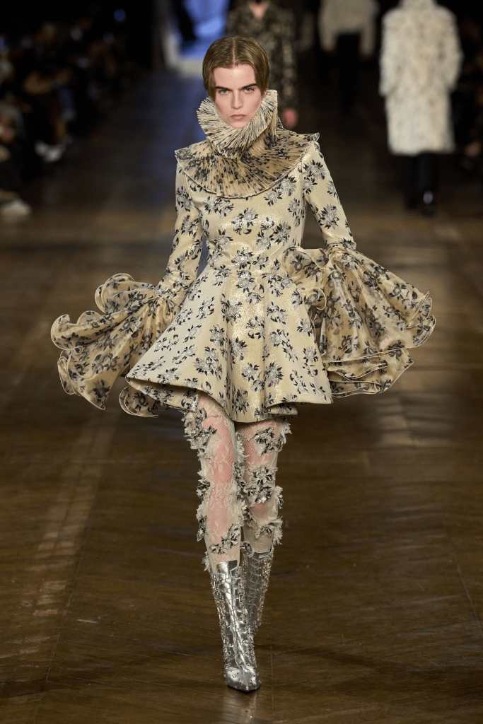 The theme of the collection was dandyism, unravelled and rewritten, inspired by artists, writers and aesthetes decorated for distinction, borrowing from the codes of the Victorian Gothic. Looks embodied a strong sense of pride, showcasing elements such as book-pleated collars, pinched Victorian shoulders, rich jacquard, form-flooding shearling and studded sunflower embroideries. It captures the dandy’s radical spirit in the modern world, as envisioned by creative director Seán McGirr.