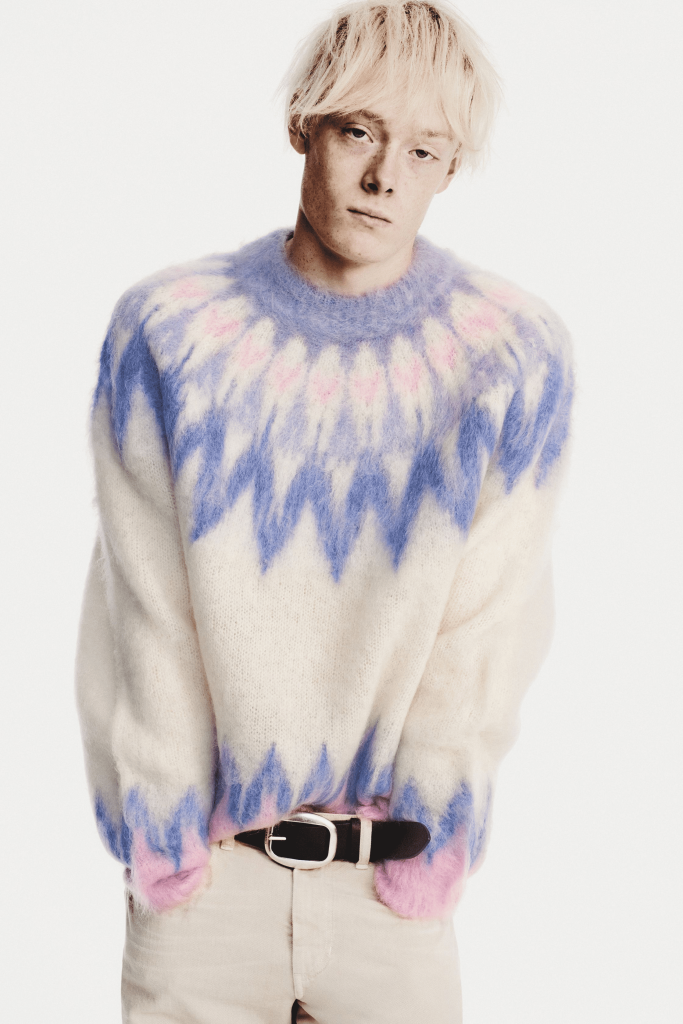 Isabel Marant toned down any hard edges this season with a flurry of soft and textured pieces. Cue thick brushed mohair sweaters in Fair Isle patterns, interpreted in shades of pastel pink and purple, warm beige and mocha, as well as chunky knit cardigans. Suits maintained their clean cuts but with a brushed flannel pinstripe to counter any strict traditional conventions, and paint finishes lent a subtle marbling effect on denim, which also saw variations in powdery pink and dusty rose.
