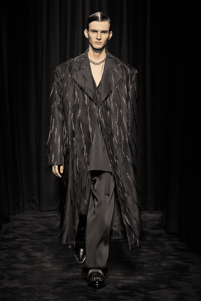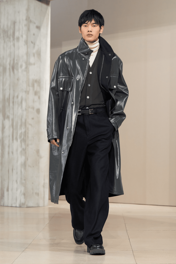 The final collection by husbandwife creative director duo Luke and Lucie Meier was a bright metaphor for love. The setting was minimal: a pitch-black stage where the only separation between the audience and the catwalk was a thin veil of curtains. This darkness set the stage for a collection that played with the concepts of shadow and light, both literally and metaphorically. Highlight pieces included impactful, thick fur jackets, double-faced wool trenches and slouchy pleated trousers. Raw cuts and textured additions, like ribbons, feathers and leaves, elevated everyday elegance.