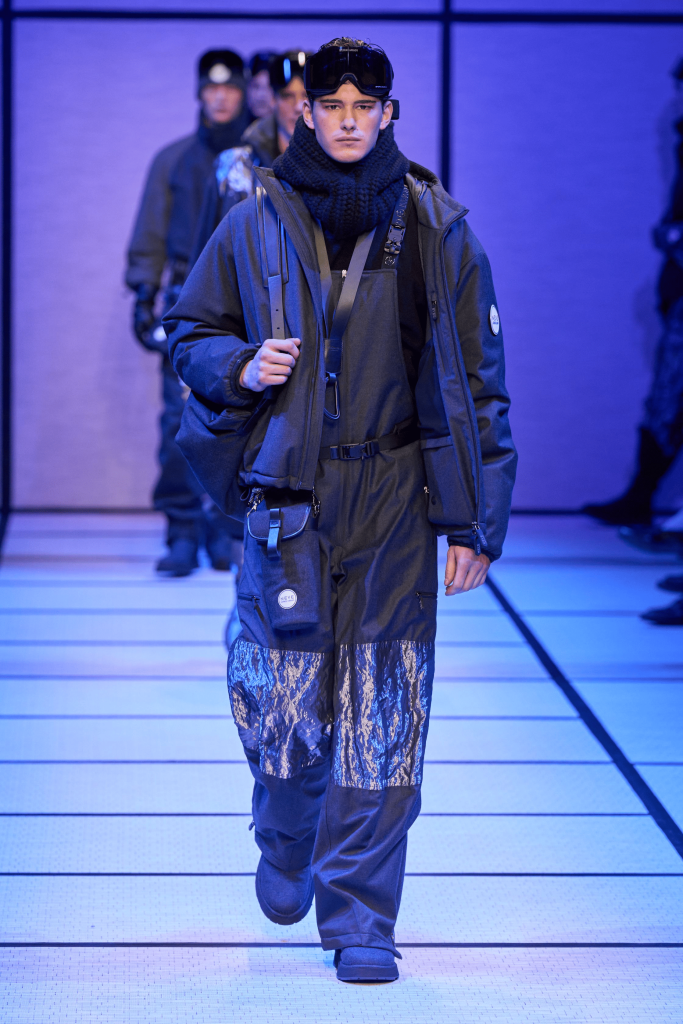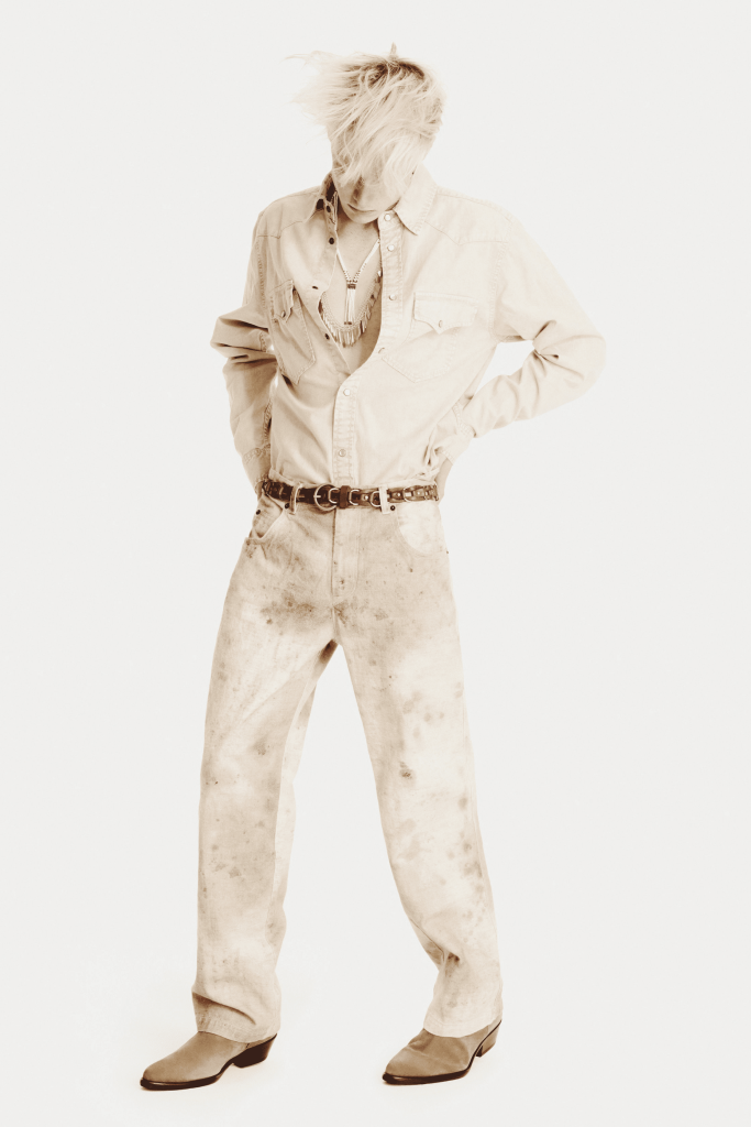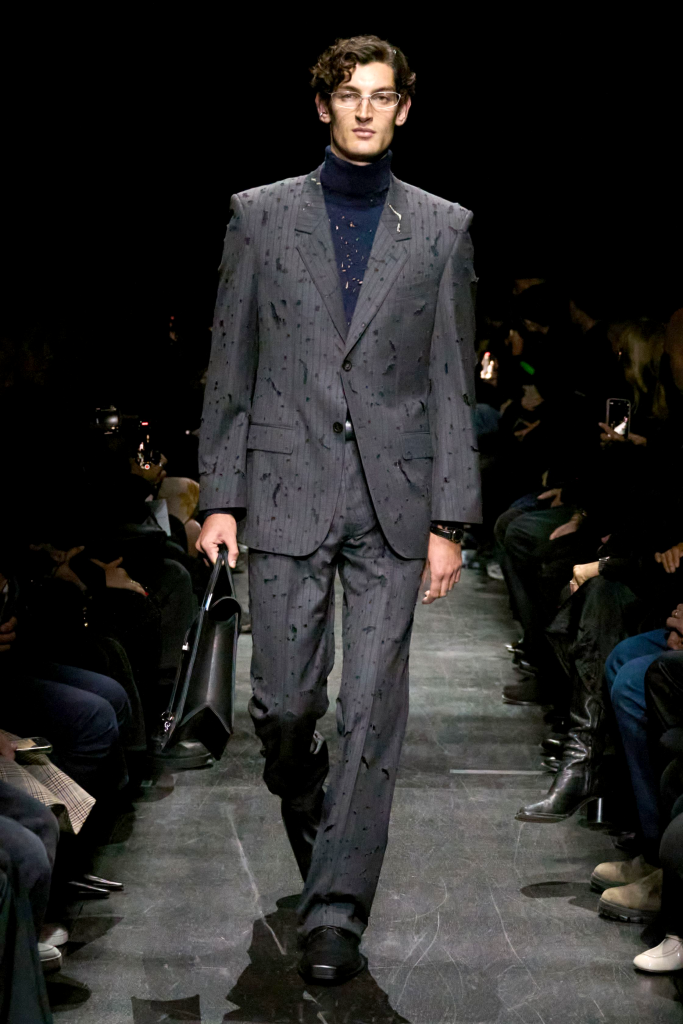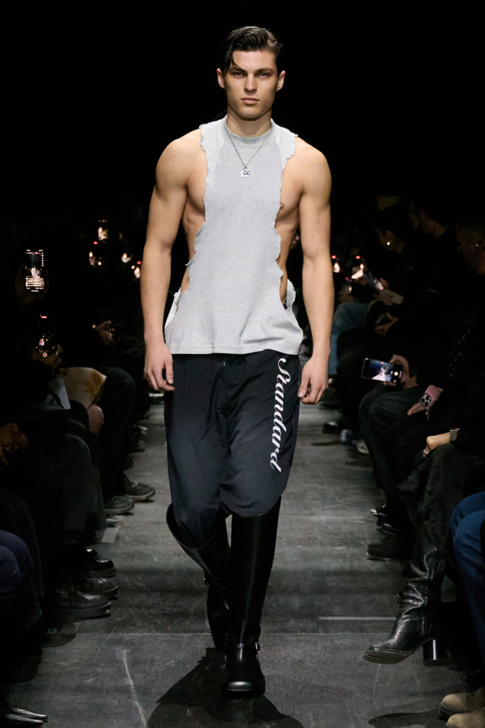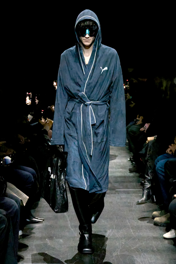 This season, Demna played with the traditional definitions of archetypal garments, from business wear to workwear and eveningwear. Presented in a maze-like backstage corridor, there were minimalistic white shirting and slouchy trousers, bikers in branded helmets, and youngsters in Puma tracksuits with gold medals slung around their necks. Scored puffers, distressed denim, hooded wool coats and shredded tank tops completed the collection.
