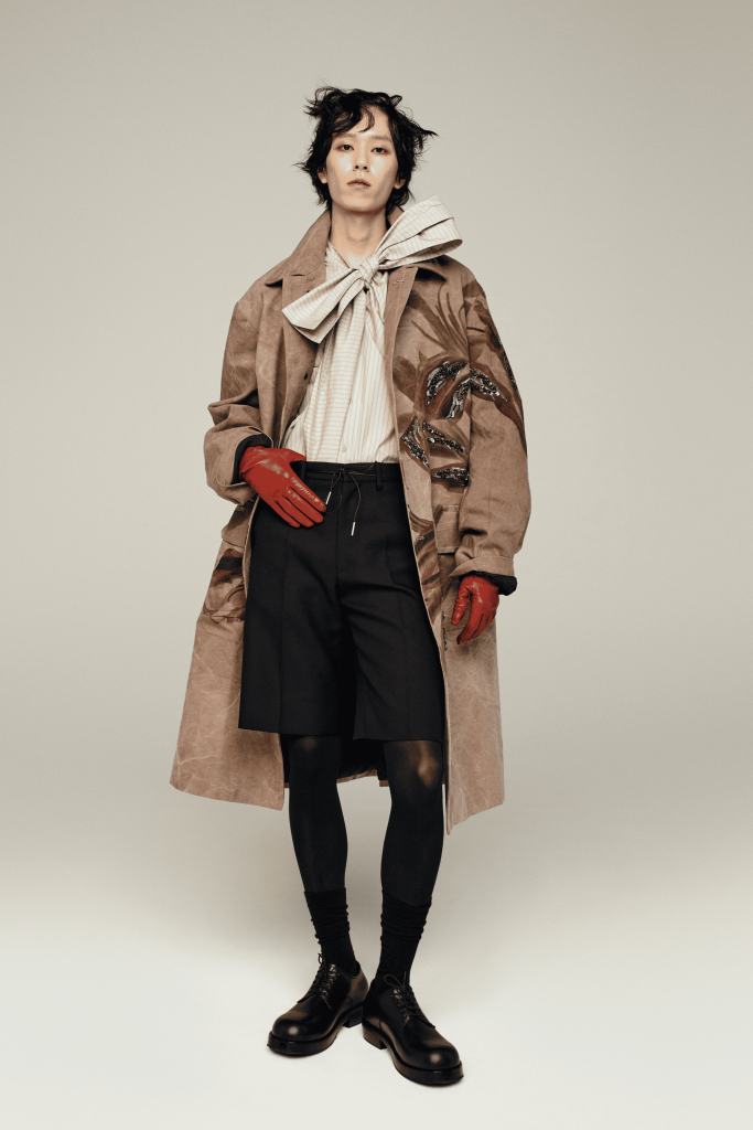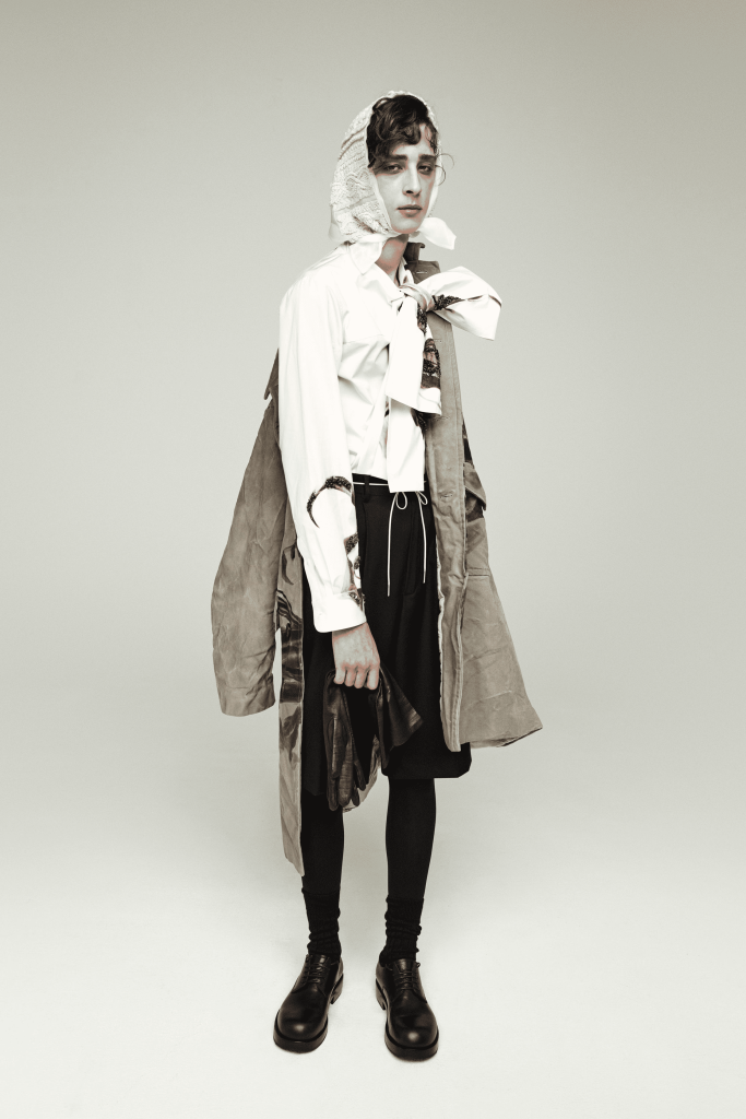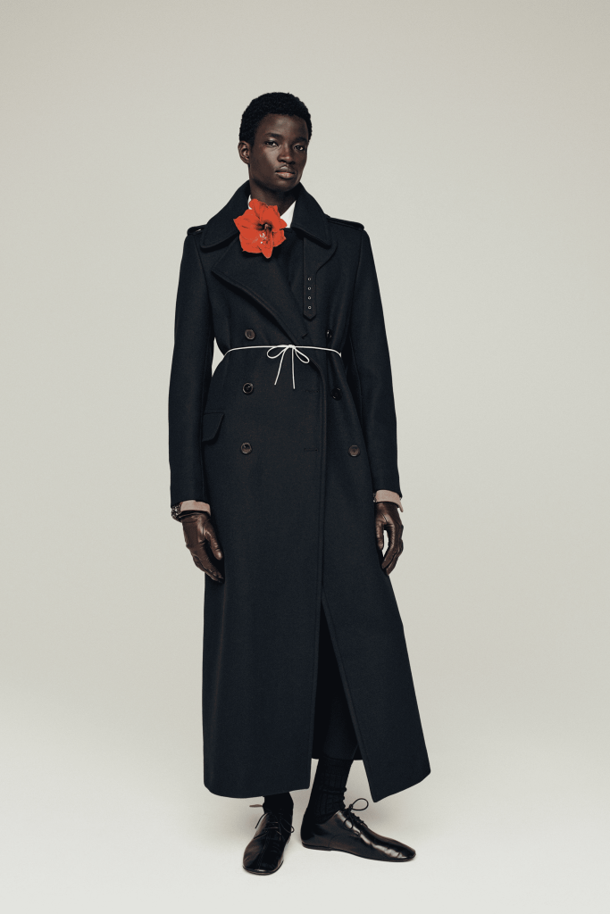 Designed by the Dries Van Noten Studio and directed by Julian Klausner, the collection captured how contrasts turn complementary. Tailoring was a consistent theme, featuring rich russet orange, ultraviolet purple and other bold hues, along with classic black in a cape coat with shoelace stitching. There were also lavish floral brooches, lavalliere collars, duchesse satin coats and dramatic leg-of-mutton sleeves that provided a delicate contrast to the earthy tones of hunting fabrics, structured sailor pants and classic peacoats. An edgier vibe emerged through bike messenger-inspired details like black leggings, shoelace belts and boots.