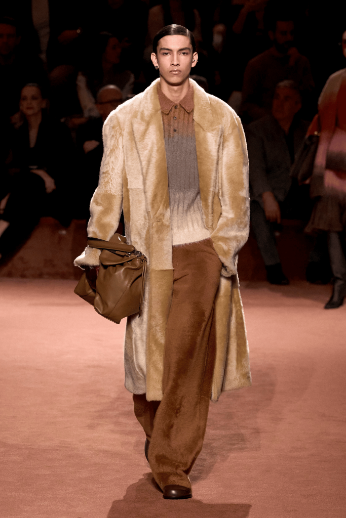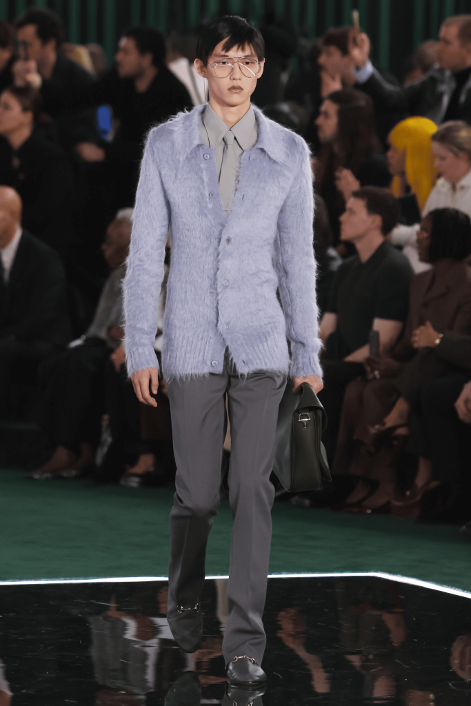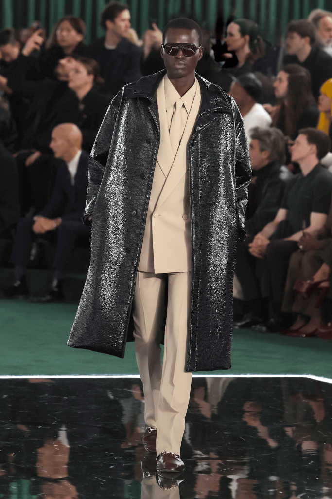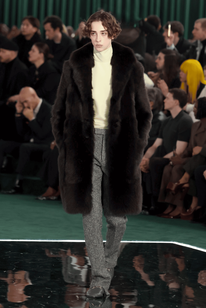 Gucci’s in-house design team delivered a collection, titled Continuum, that blended the past, present and future, echoing the house’s long-standing ethos of reinvention. Shown in tandem with the women’s, the men’s looks focused more on tailoring, with double-breasted suits accompanied by matching shirts and ties and single-breasted ones worn with tissue-thin turtlenecks, along with car coats in vinyl, patinated animal print or tweed.