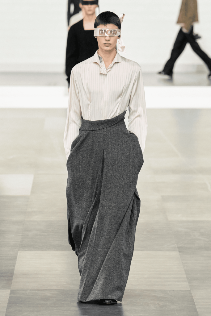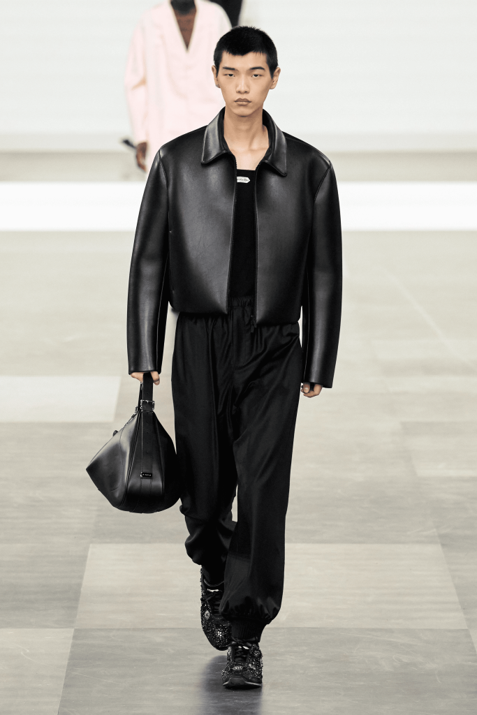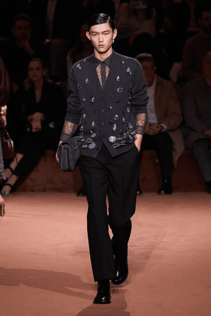 Kim Jones’s fall collection was all about the clothes, presented in a clinically bare space to highlight the fabrics and construction that distinguish luxury clothing from massproduced garments. The pieces featured exquisite details, such as a folded neckline on a black leather sweatshirt inspired by founder Christian Dior’s H-line silhouette and glass beads scattered like raindrops on the shoulders of a navy suit. A raised drawstring collar and buckled sleeves added a structured touch to a black utility jacket.