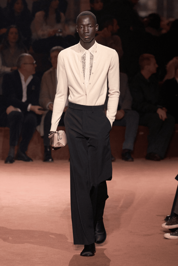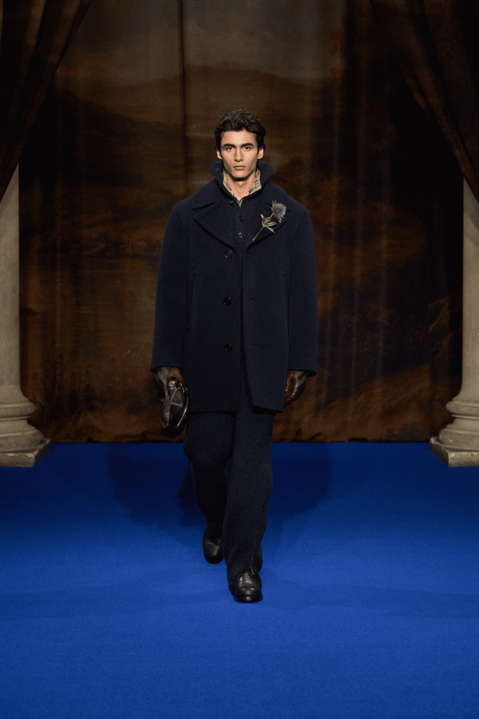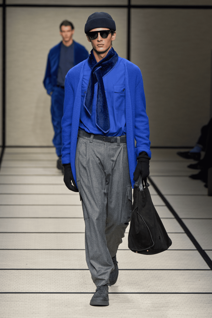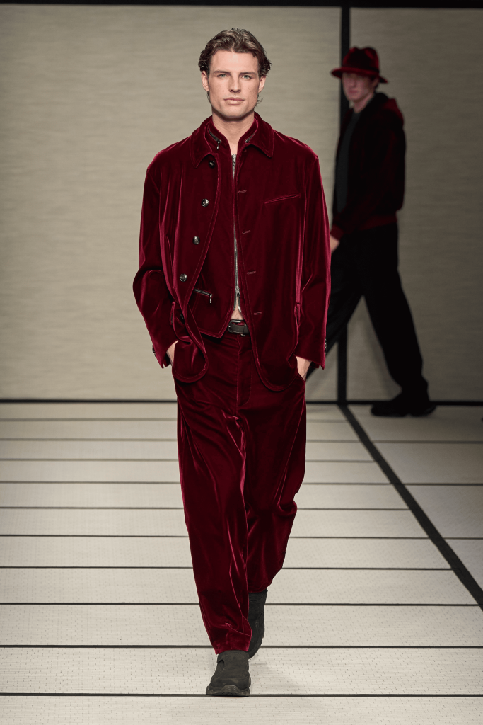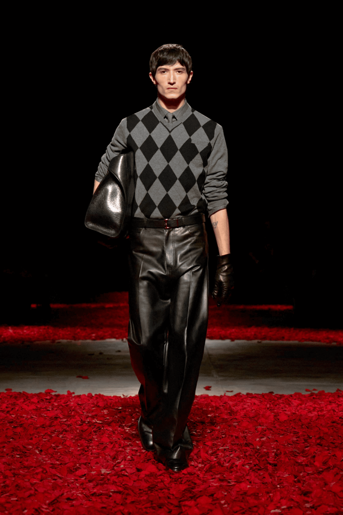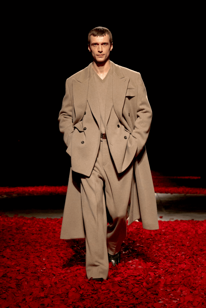 Unveiled in Milan with the city’s timeless Via Manzoni serving as the perfect backdrop, Giorgio Armani’s collection celebrated fluid elegance and freedom of movement, blending luxurious fabrics with timeless design. Luxurious cashmeres, wools and silks elevated the looks, which were also enlivened by precious touches of ruby red, emerald green, and Armani’s classic deep blue. Day segued to night with cropped jackets styled with caps and bags giving way to tailored, loose-legged three-piece suits and finally, sharp and sexy evening wear.