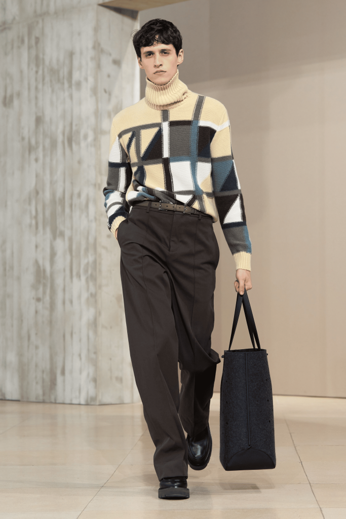 Véronique Nichanian drew inspiration from racing skills to infuse her collection with “strength and energy.” It featured cosy fabrics and a muted, dark colour palette with shades of grey, black and navy, punctuated by strategic pops of colour. Sweaters and zip-front jackets were adorned with chevrons and other sharp geometric patterns, while tailoring elevated the lineup by bringing a refined formality. Layering was minimal to keep silhouettes sleek.