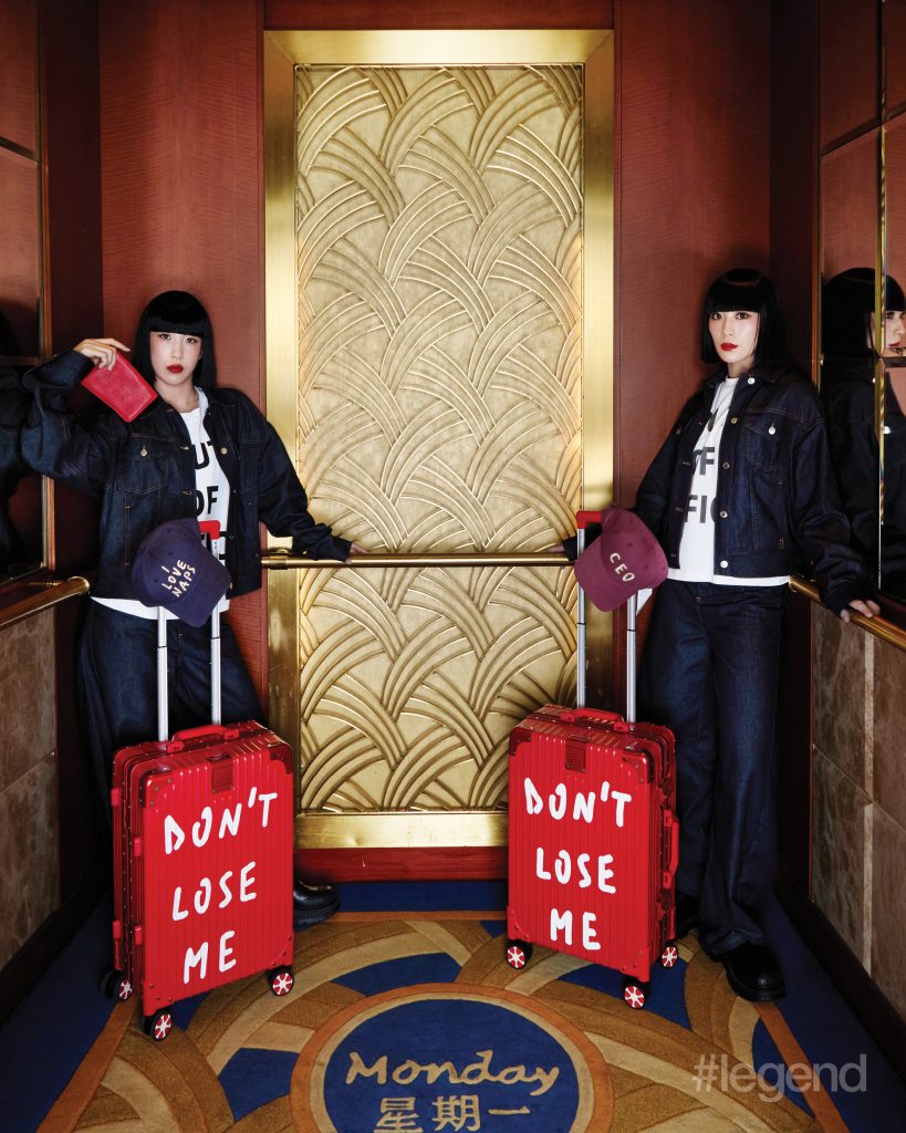Pietro Terzini &Co.llaboration denim jacket, T-shirt, jeans, and 1-800 Gift Alert cap, passport holder and suitcase _ MAX&Co.