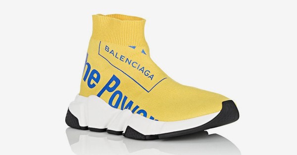 Printed on these comfy mid-top sneakers is the message “The Power of Dreams” in blue, which recurs throughout the collection and is meant to allude to “designer Demna Gvasali’s message of optimism this season.” Designed to fit (and look) like a sock, the canary yellow elastic knit Speed sneakers also feature a white sole and Balenciaga’s logo in the style of Edeka’s original graphic.