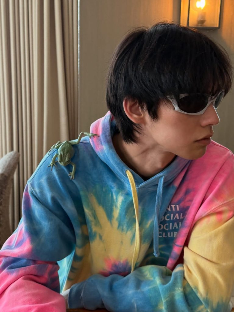 Bright usually favours a simple all black fit for events. After all, you can’t go wrong with that! But in his downtime, he has been known to pick colourful pieces like this rainbow tie dye hoodie by Anti Social Social Club. His pet frog adds a nice pop of green to look. Kermit collaboration soon?