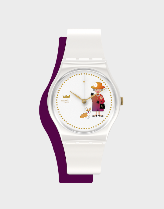 This is very dear to my heart as it’s a playful and surprising tribute to an iconic lady who became a pop culture phenomenon as much as she embodied one of the oldest institutions in the world. Her sense of style and colour, her typically British wit, her ability to stand out in the crowd and her motto “Let’s not take things too seriously”, resonates with me as an unexpected, yet totally authentic, Swatch attitude.