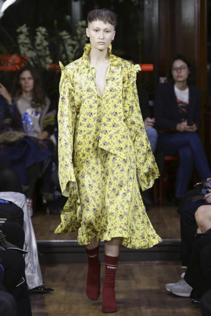 The beginning of his infamous collaborations, the DHL T-shirt is a perfect characterisation of Demna’s provocative, humorous approach to clothing. The predecessor to his work with the most ridiculous and unexpected of Crocs heels, Fortnite hoodies and McDonald’s slides the criticism of excessive branding in subversive graphics toyed with consumerism and traditional aesthetic values. Trying out more unconventional shapes and cuts, the collection also marked the debut of his use of florals. A motif that he shares with Balenciaga’s eponymous founder, vibrant palettes and contrasts made the loud statements that he’s become known for.