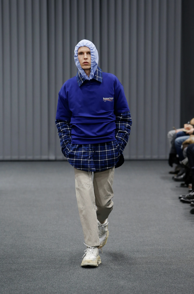 Although not the first with the maison, it’s where we first see the Triple S. massively chunky soles, intense colourways that toe the line of downright eye-soring, and a still lasting influence on sneakers and arguably one of the starting points of street-casual’s slow absorption into luxury. Altering the looser proportions of the oversized silhouette’s previous iterations, boxy shoulders and varying jacket lengths made for a more explicit delineation of the body. Continuing with his ironic graphics, this show can’t be discussed without mention of its Bernie Sanders campaign parodies the emergence of his later injections of political themes into presentations.