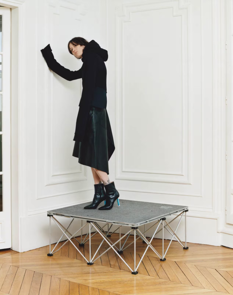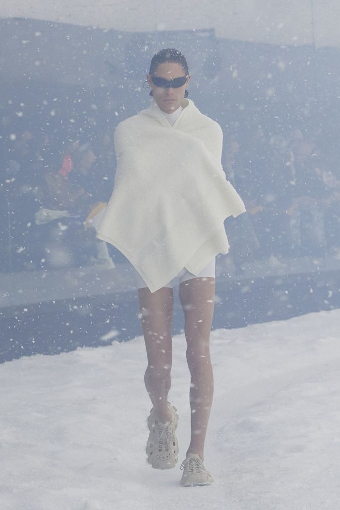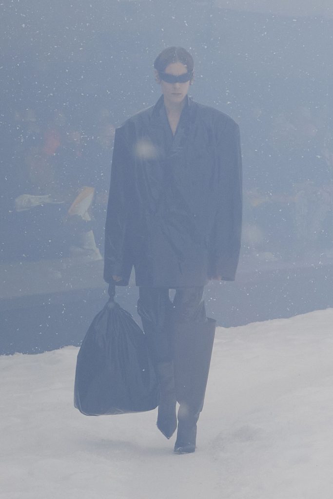 Better known as the snow globe show, this is probably the moment Demna fully leaped into the dark side. Greatly inspired by the Russo-Ukrainian conflict and the awakening of his own wartime trauma, bags resembled sacks of rubbish and clothes were made from mundane items like tape and towels. The knife pumps represent the latest form of the prototypal sock-trainers and stiletto heels, merging bodysuits with footwear.