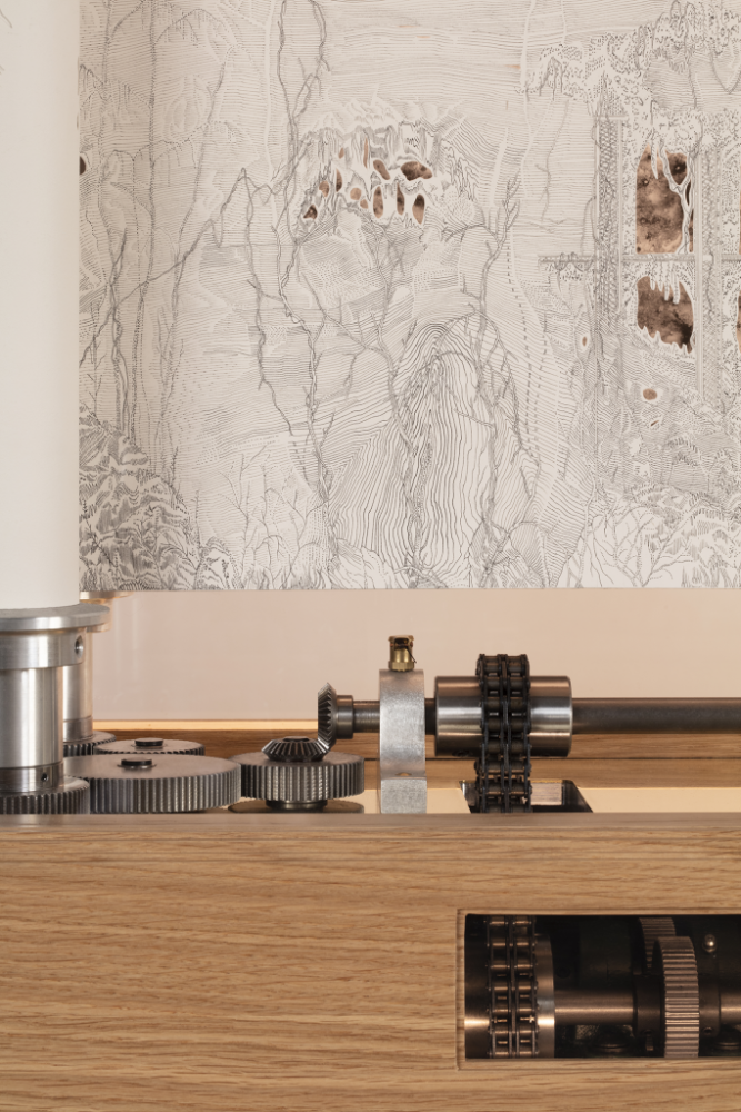 Jospin’s installation of cardboard sculptures, hauts-reliefs, embroideries and drawings for Ruinart are centred around a carmontelle, an 18th-century invention for showing landscape paintings in motion by French dramatist, painter and designer Louis Carrogis Carmontelle. Composed of a long roll of paper stretched between two cylinders, the images unfurl with the turn of a small crank.