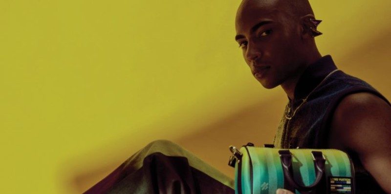 Multicolour graphic sweater and black pants by Louis Vuitton; Smile buckle belt by Loewe;