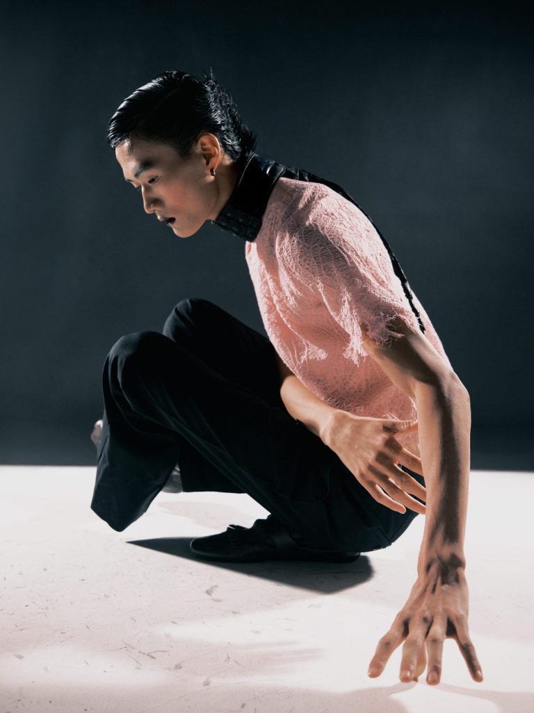 Pink high-neck top and; black trousers _ McQueen; Black leather shoes _ Prada; Black leather choker _ Miska