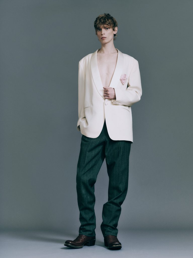 White blazer, green trousers, brown boots and floral pin _ Prada