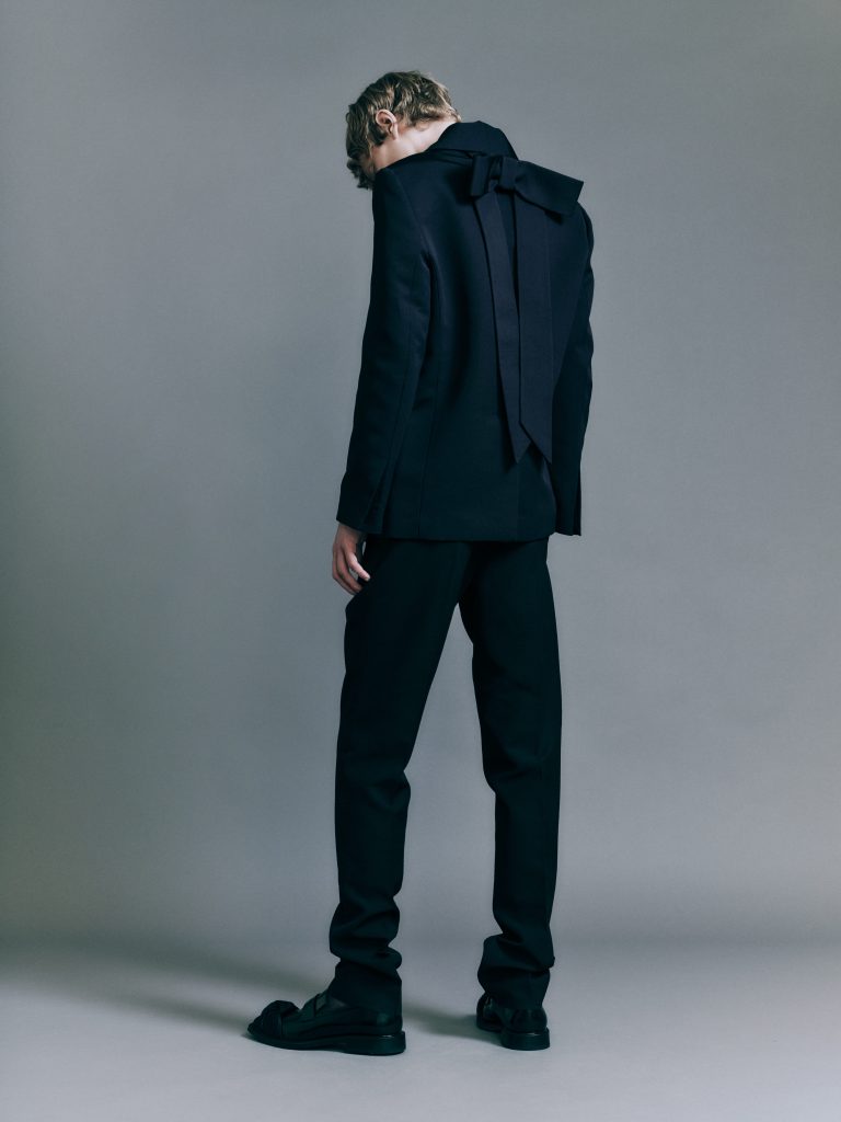 Navy jacket with bow detail, and black trousers and shoes _ Dior