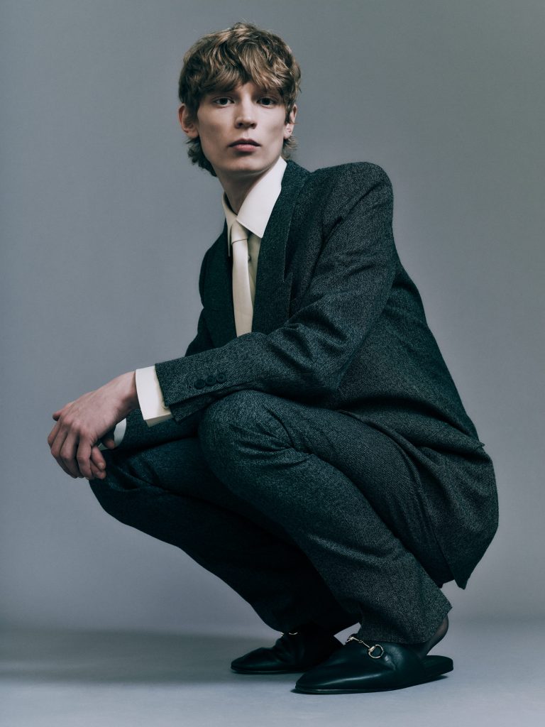 Grey jacket and trousers, white shirt and tie, and black slides _ Gucci; Socks _ Falke