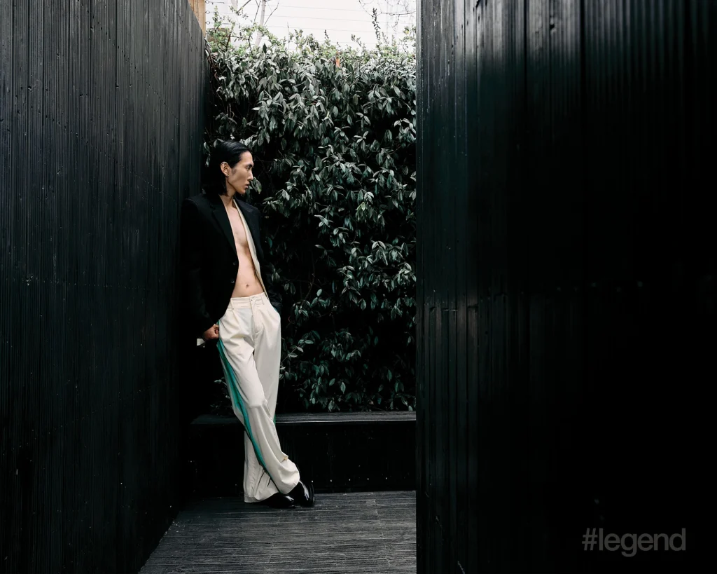Black blazer and white trousers _ 8on8; Black shoes _ Gucci