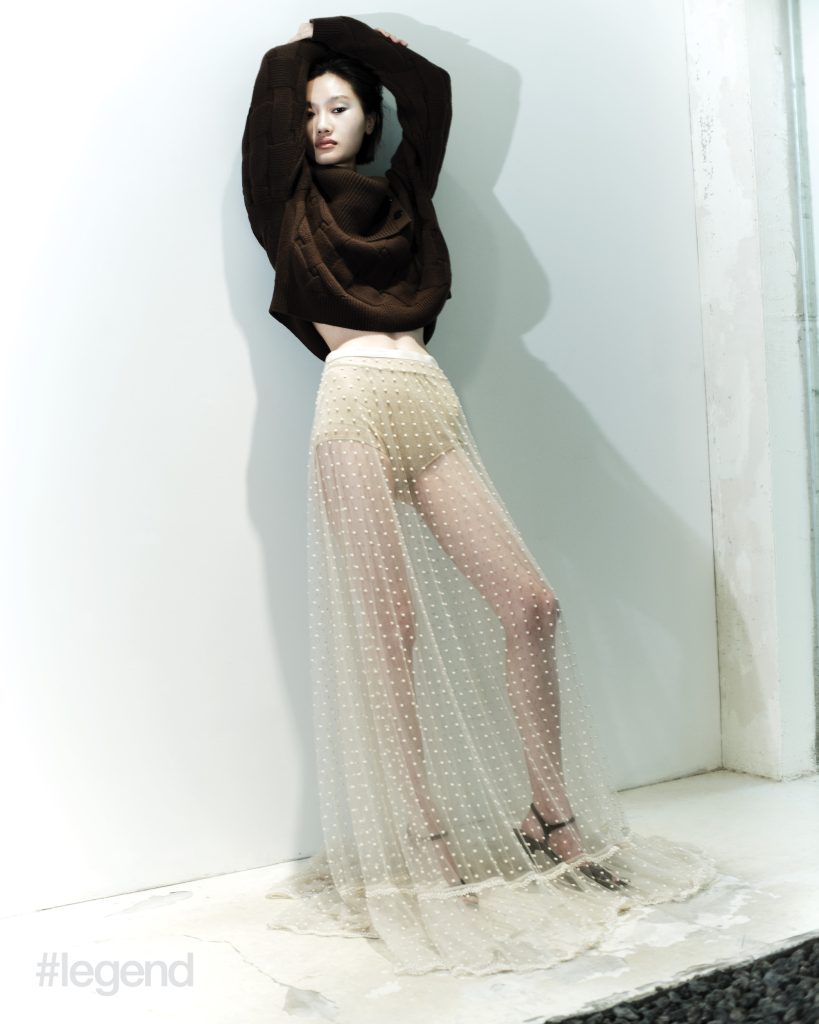 Brown sweater _ Hermès; Beige briefs and mesh skirt _ Dior; Black heeled sandals _ Balenciaga