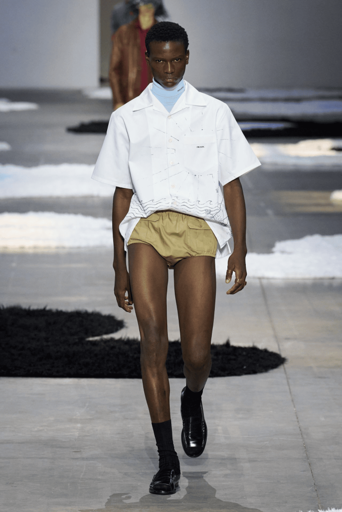 Short hems are climbing much higher up the thigh this season. Prada kicked off the micro short trend in Milan’s Fondazione Prada, with its answer to sister brand Miu Miu’s miniskirt from the womenswear season, sending out some of the shortest shorts of the season, and even a pair of skimpy khaki bloomers with practical front pockets; a collection of boyish innocence that channelled the “opposite of aggression, power, nastiness”. Elsewhere, Saint Laurent unveiled a series of pleated mini shorts in dark chocolate and black, in an homage to those worn by founder Yves Saint Laurent in his youth, while Japanese brand Wooyoungmi featured micro shorts in a 1920s-style, bodysuit version; for a fashionarchives twist on this mainstay men’s fashion staple that isn’t going anywhere.
