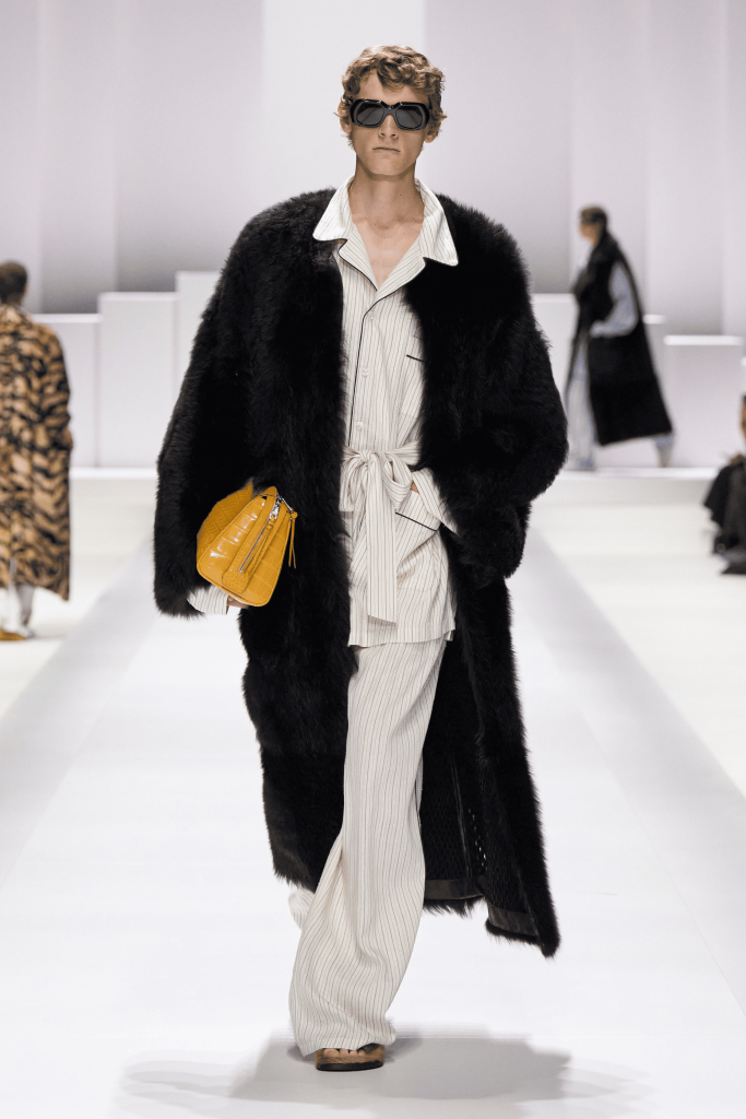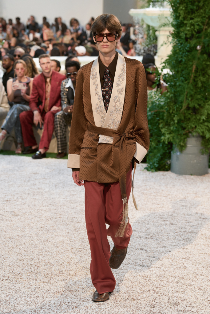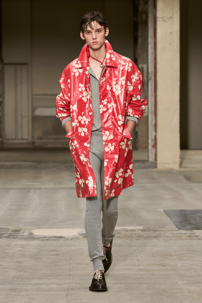 Elsewhere, tiger print was infused into faux-fur coats at Kenzo, Bluemarble translated the Toulon–Mont Faron cable-car route into a photographic print that climbed up the legs of tailored trousers, and illustrations of mini dinosaurs and palm trees were stamped over relaxed suits at Louis Vuitton; leaving a playful mark on one of menswear’s most joyfully refined seasons yet.