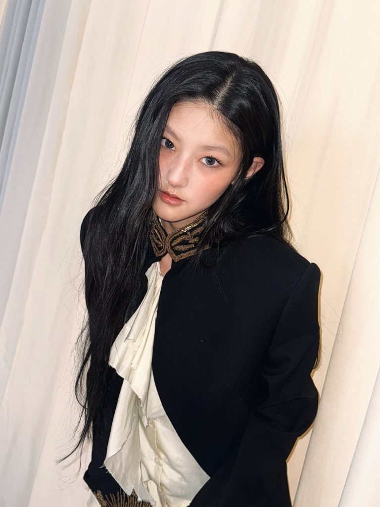 Her base is light and skin-like with a clear sheen; the eyes are kept soft with champagne tones and subtle pearl. Also,  with the separated lashes that aren’t heavy. Peach milk-tea blush and a glossy rose–mauve lip topped with clear gloss complete the look. This creates an elegant Korean-style make-up. Such looks are especially popular at Christmas gatherings or family parties, striking a balance between natural realism and festive glow.