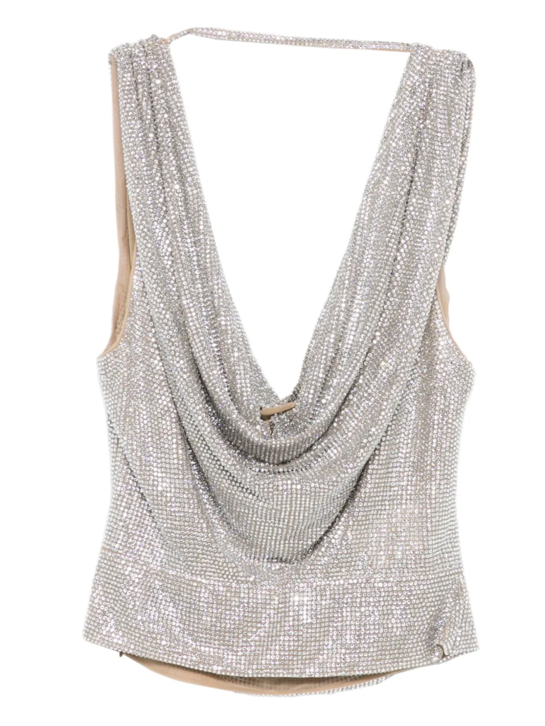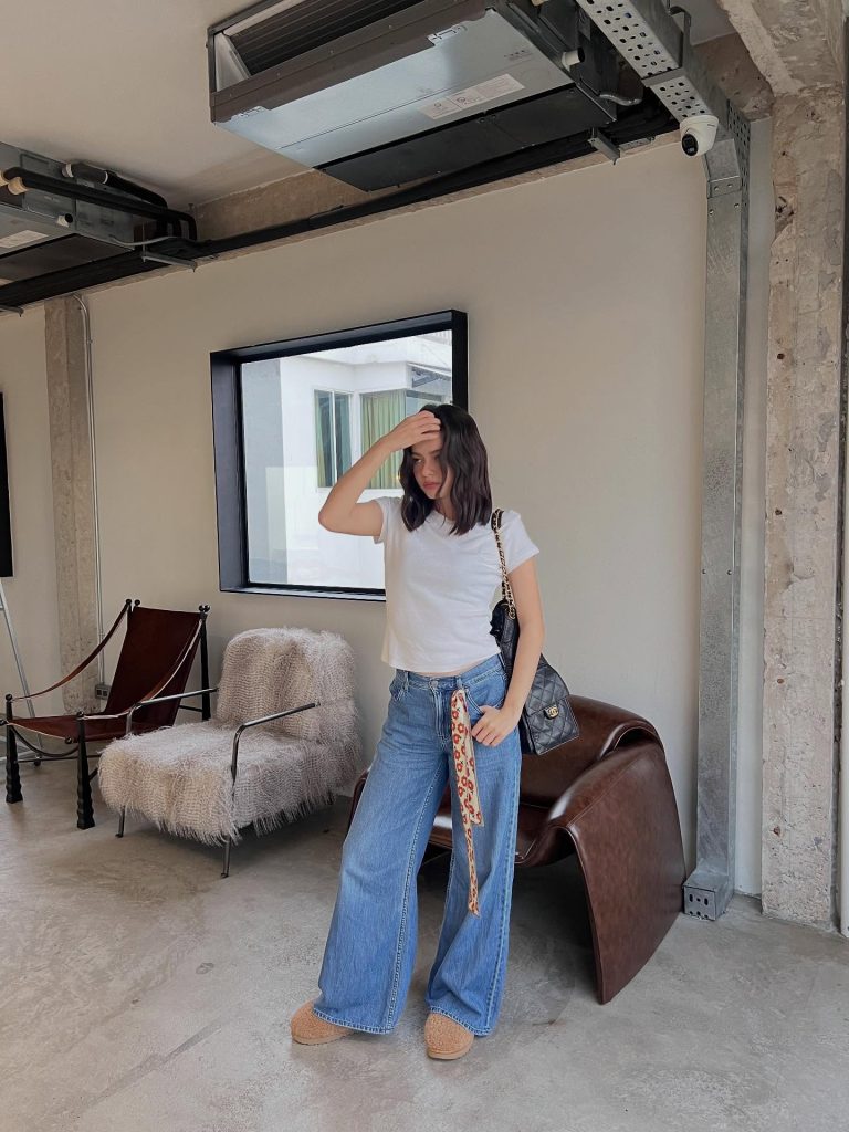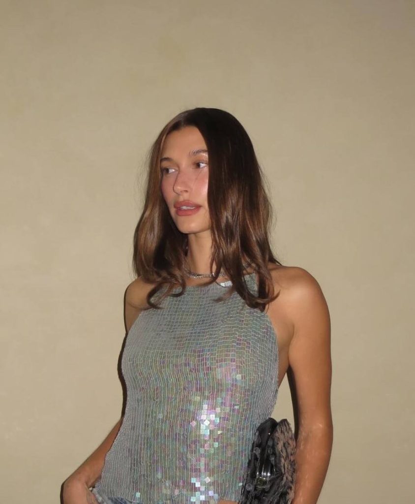 Hailey pairs a glamorous sequin vest with ultra-baggy ’90s jeans. Paired with slim-heeled sandals and minimal jewellery. Placing her energy somewhere between party and casual, the charm she always exudes.