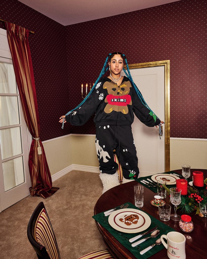 North builds her look around an oversized black co-ord covered in adorable prints. Ghosts, snowflakes, teddy bears that boldly blending street style with Christmas. The brown plush bear and white snowflake details on the top add a festive touch. The wide, straight-leg joggers extend the visual theme with white ghost motifs. Her furry boots look like soft piles of warm snow, perfectly echoing the winter mood.