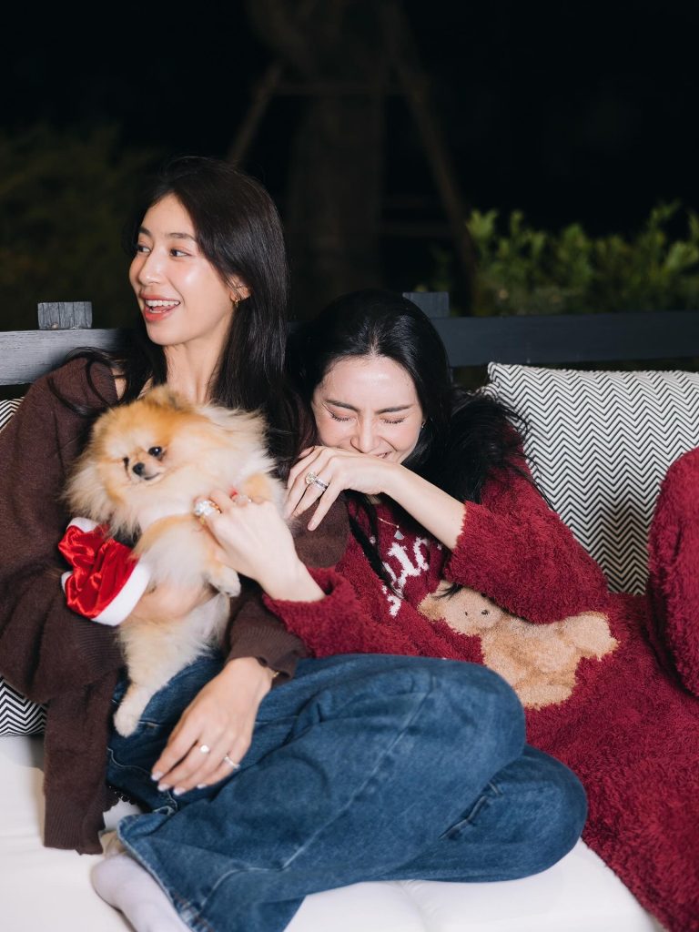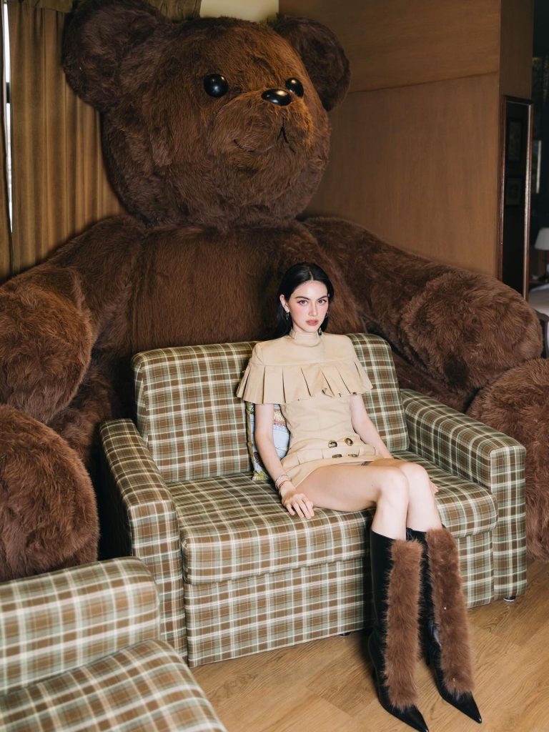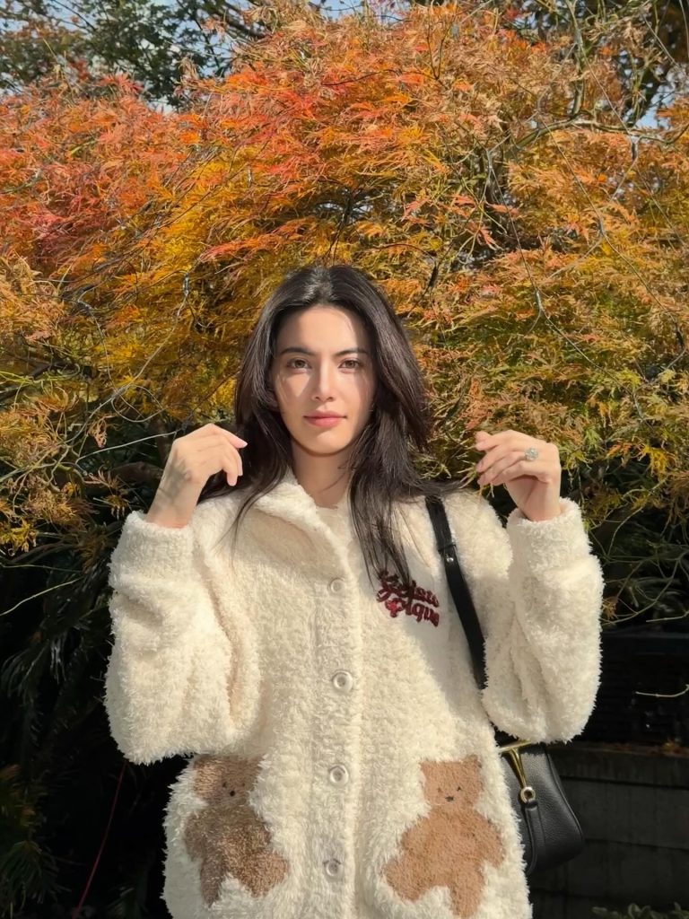 A beige furry jacket features button detailing and teddy bear pockets, with playful elements. Paired with a black shoulder bag, the look returns to a mature, composed tone. This approach allows cuteness to shine as an accent, effortless yet intentional.