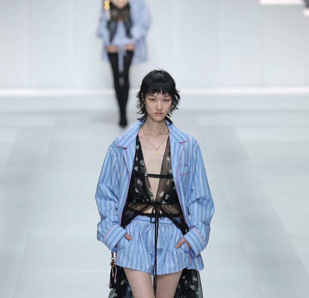 A recurring theme was lightness, designers embraced fabrics that seemed to float with movement. Max Mara’s organza hems rippled like sea anemones; Fendi layered pleats with floral gauze; Prada draped sheer skirts that hovered effortlessly. These pieces shifting with light and motion. Dolce & Gabbana paired pyjama sets with airy lace and mesh underpinnings, balancing languid ease with sensuality.