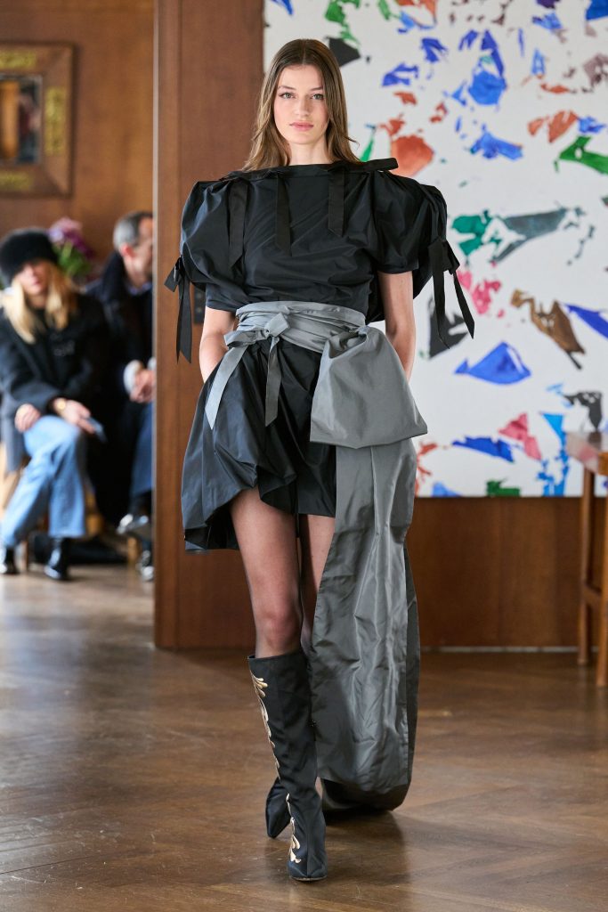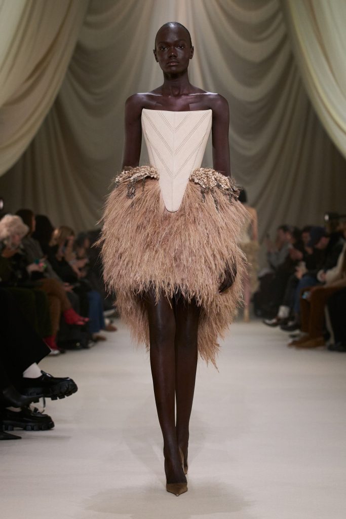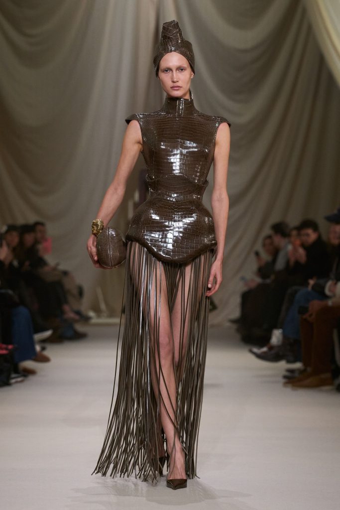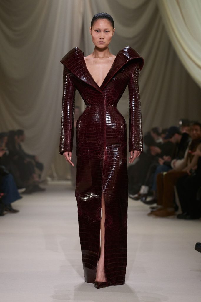 Ashi Studio refined its signature dark romanticism through architectural precision and saturated depth. Sculpted corsetry, exaggerated shoulders and extended trains formed commanding silhouettes. High-density tulle and metallic embroidery introduced a sense of futuristic ritualism. The collection balanced drama with control, positioning couture as performance-ready spectacle while maintaining the house’s disciplined structural clarity.