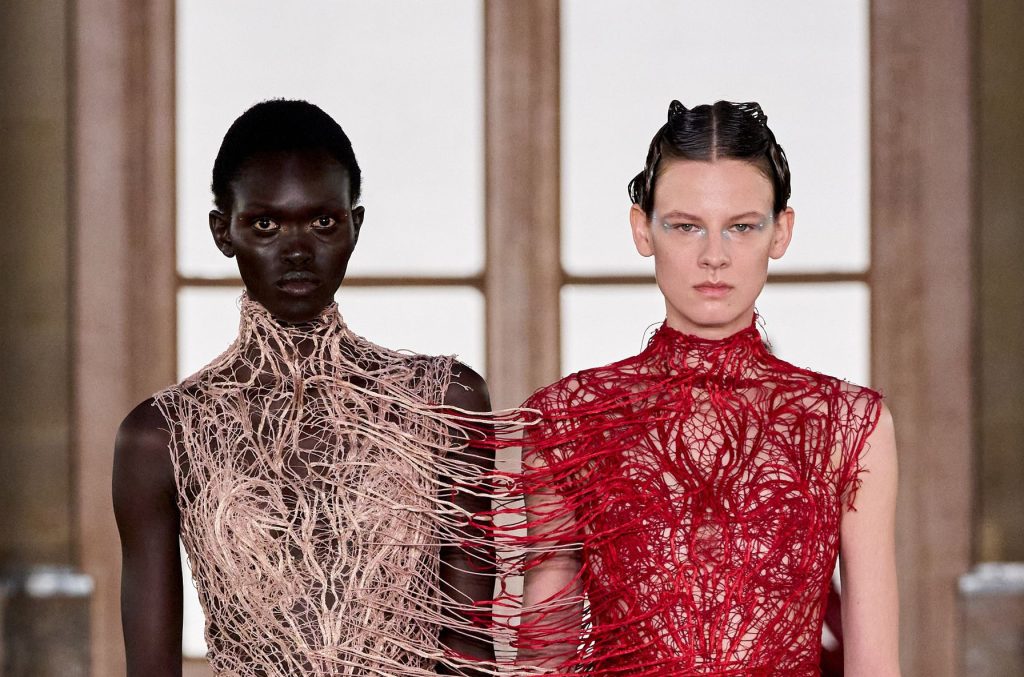 Ashi Studio refined its signature dark romanticism through architectural precision and saturated depth. Sculpted corsetry, exaggerated shoulders and extended trains formed commanding silhouettes. High-density tulle and metallic embroidery introduced a sense of futuristic ritualism. The collection balanced drama with control, positioning couture as performance-ready spectacle while maintaining the house’s disciplined structural clarity.